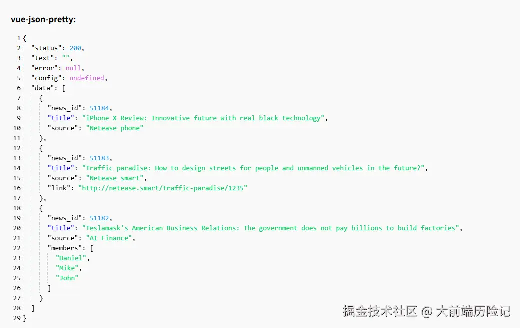调研了下Vue生态中有两款出色的组件:vue-json-pretty和vue-json-viewer,它们都能将JSON数据变得直观易读。