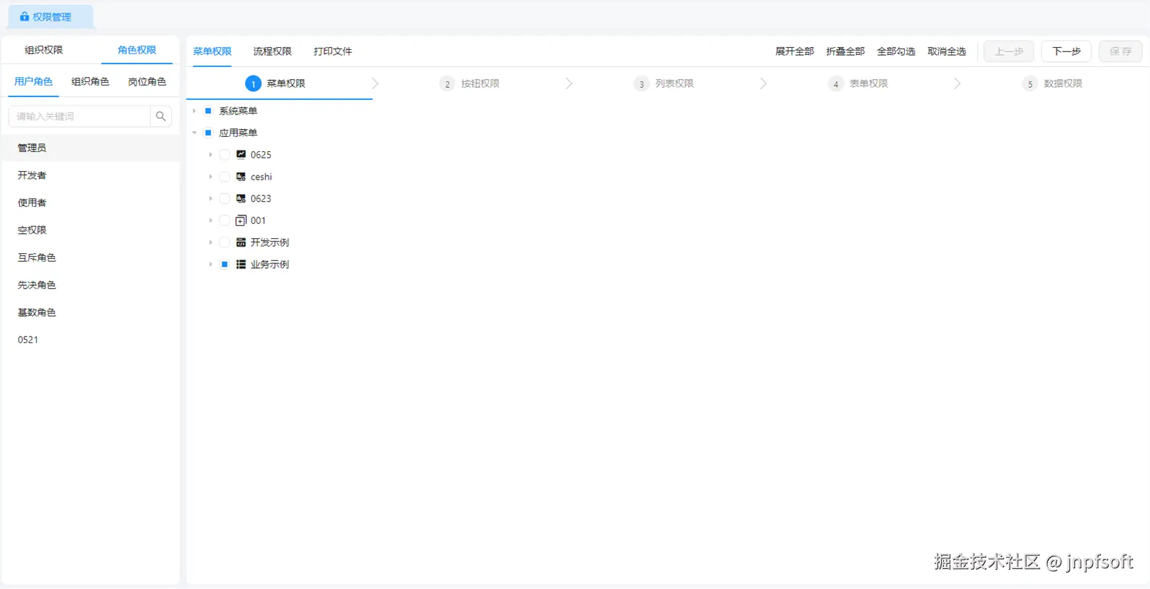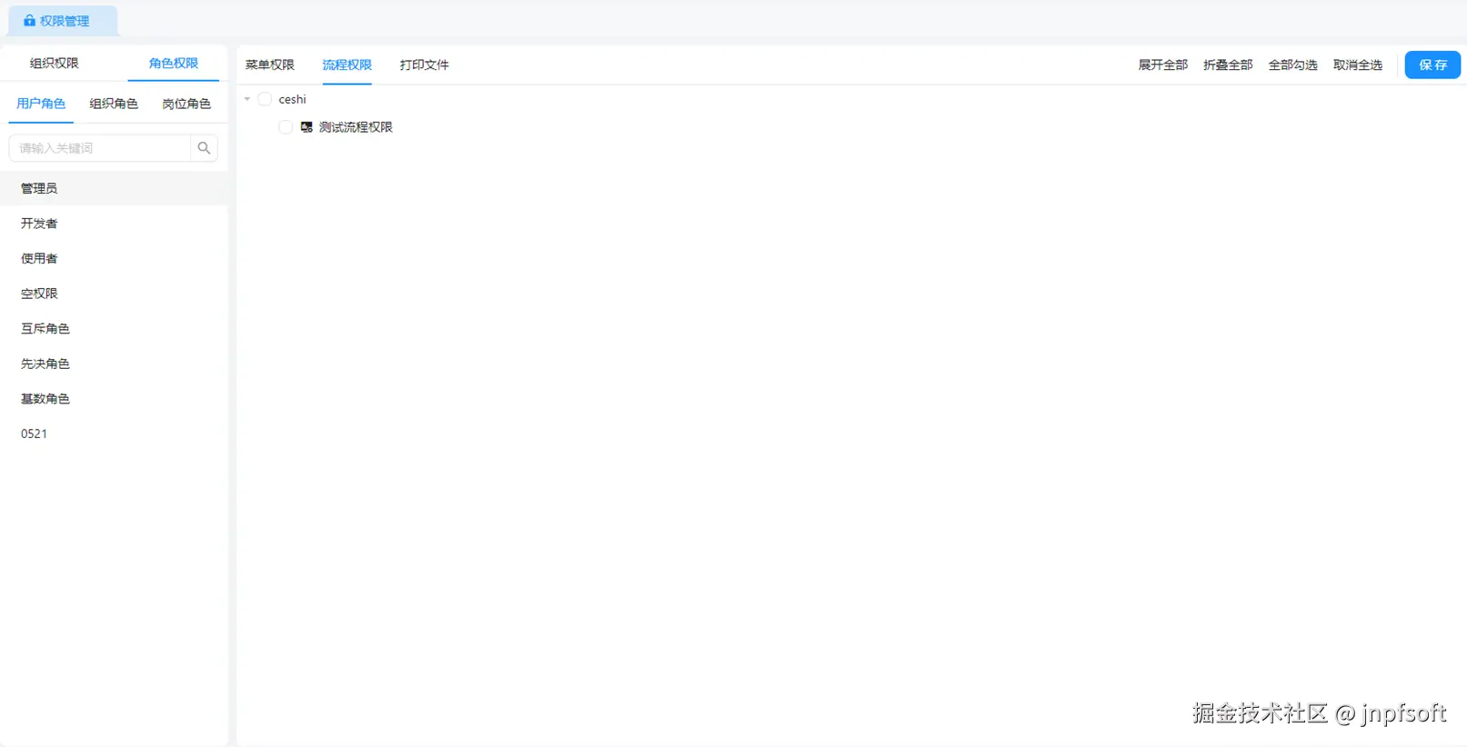 JNPF 角色权限管理直接拯救强迫症!三类角色一站式授权,菜单、流程、打印文件权限全涵盖,展开全选、取消全选功能秒上手,不用反复点来点去~ 不同角色权限边界明明白白,新手也能 5 分钟搞定精准授权!