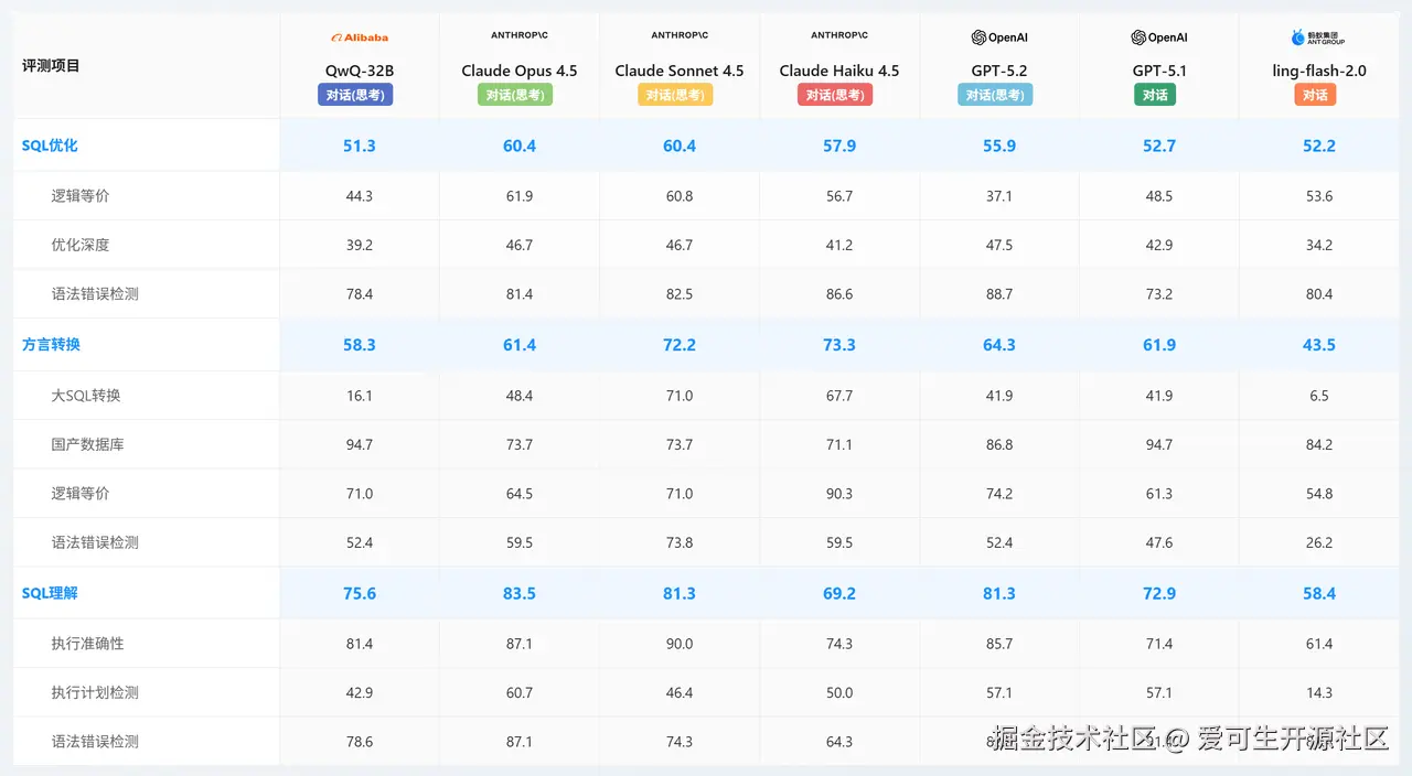 - 能力核心:该模型在 SQL 理解(83.5) 和 SQL 优化 (60.4) 两个最关键的维度均取得了全场最高分。它在执行计划检测(87.1) 和逻辑等价性(61.9)方面表现出极高的稳定性。