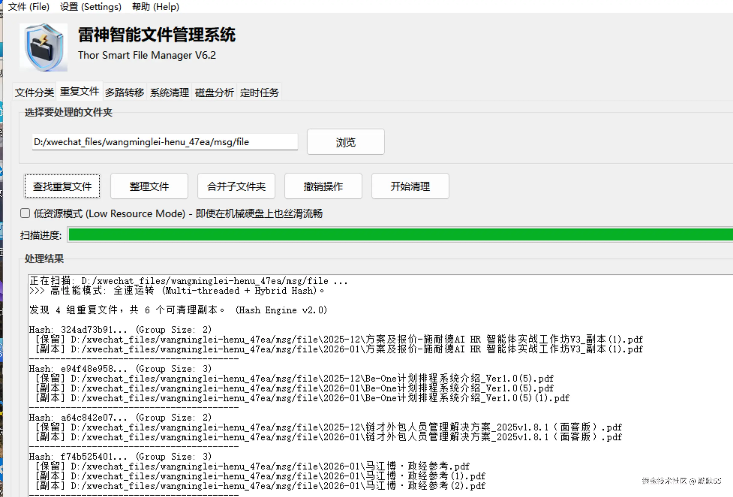 - 智能去重 (Transform - Cleaning): 这是关键!NotebookLM 的上下文窗口是有限的,不能浪费在重复内容上。 雷神基于 MD5 哈希算法,发现我有 6 份《AI 面试官技术原理解析.pdf》,虽然文件名被微信改得乱七八糟(有的叫AI面试(1).pdf,有的叫wx_file_293.pdf),但雷神识别出内容一致,自动删除 5 份,保留 1 份最新版。