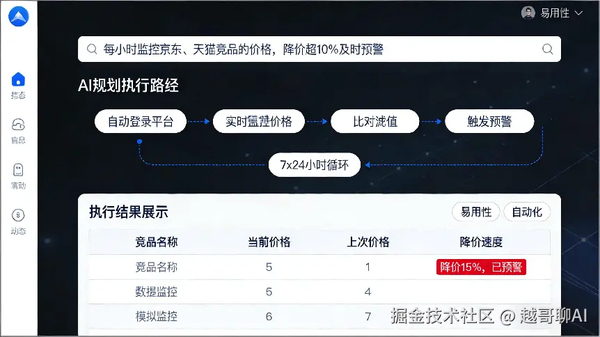 我身边不少企业朋友都在用这款工具,最让他们认可的是“一句话生成流程”的AI能力。比如电商运营需要监控竞品价格,只需说“每小时监控京东、天猫竞品的价格,降价超10%及时预警”,实在Agent就会自动规划执行路径,7x24小时不间断监控,无需手动编写任何脚本。这种易用性打破了技术壁垒,让财务、运营、HR等岗位的员工都能自主创建自动化流程。