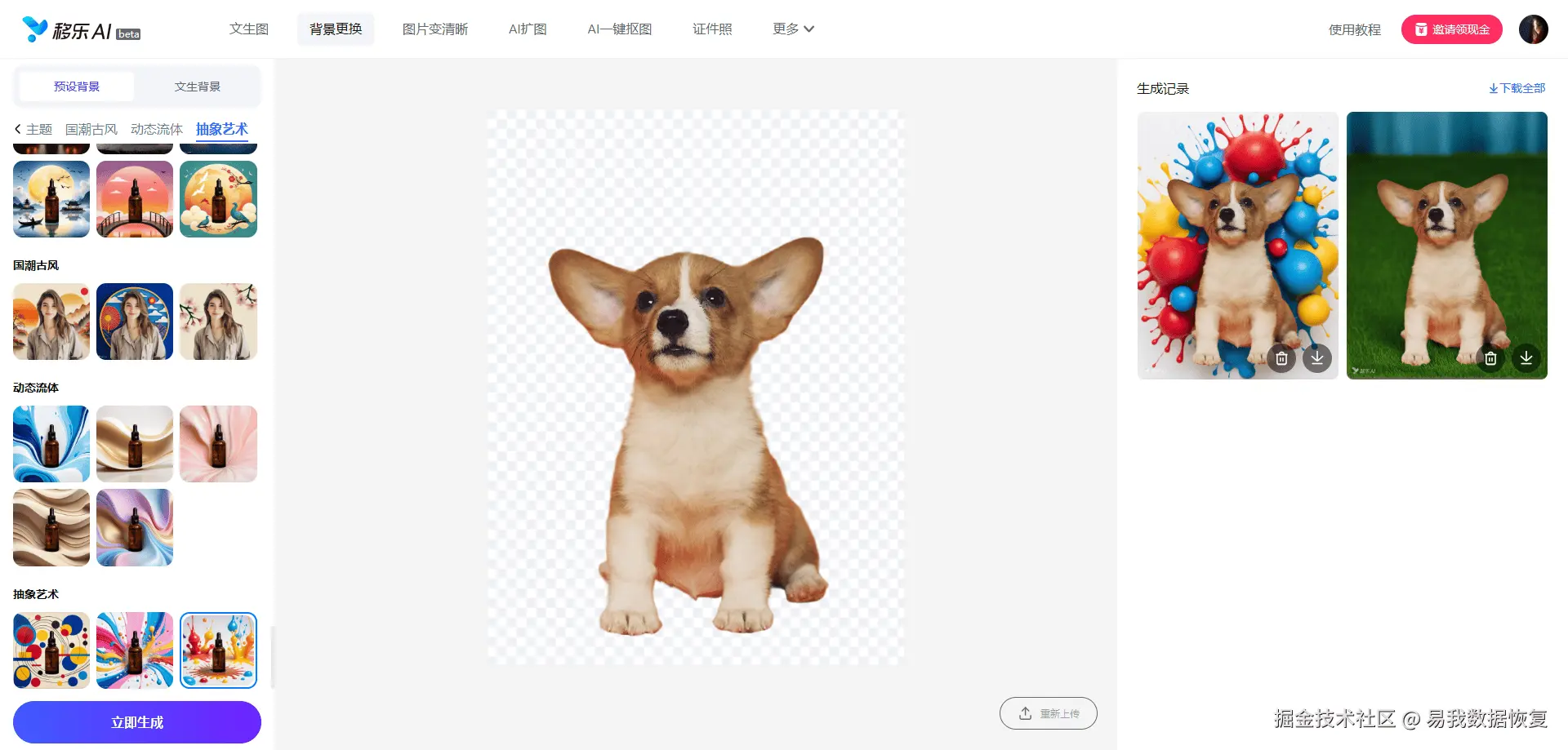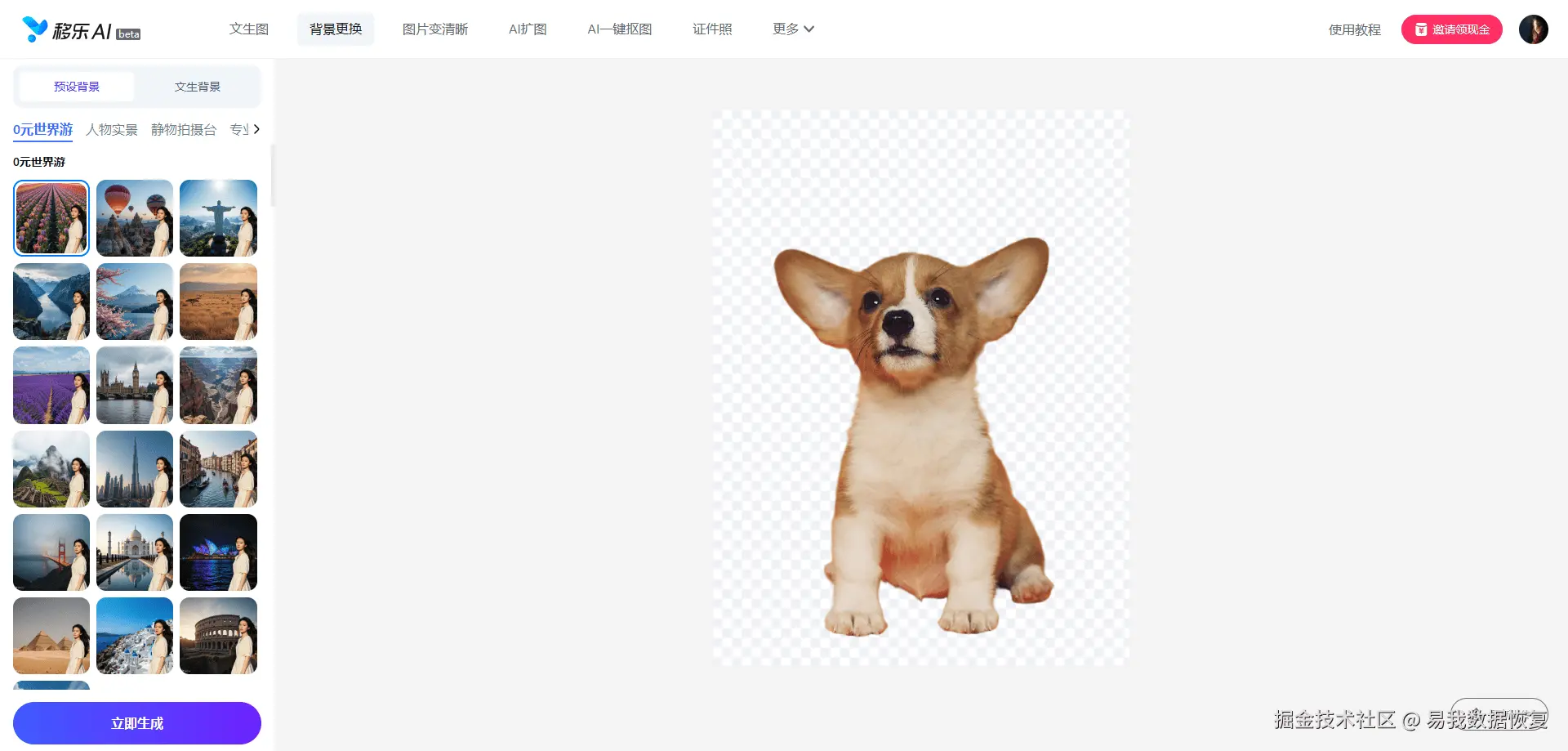 3.选择左侧预设背景库里的背景,或文生图背景,确定后点击“立即生成”,等待约10秒,右侧会显示重新生成背景的图片,无误可直接下载无水印高清图,也可以重新选择背景图再次生成。