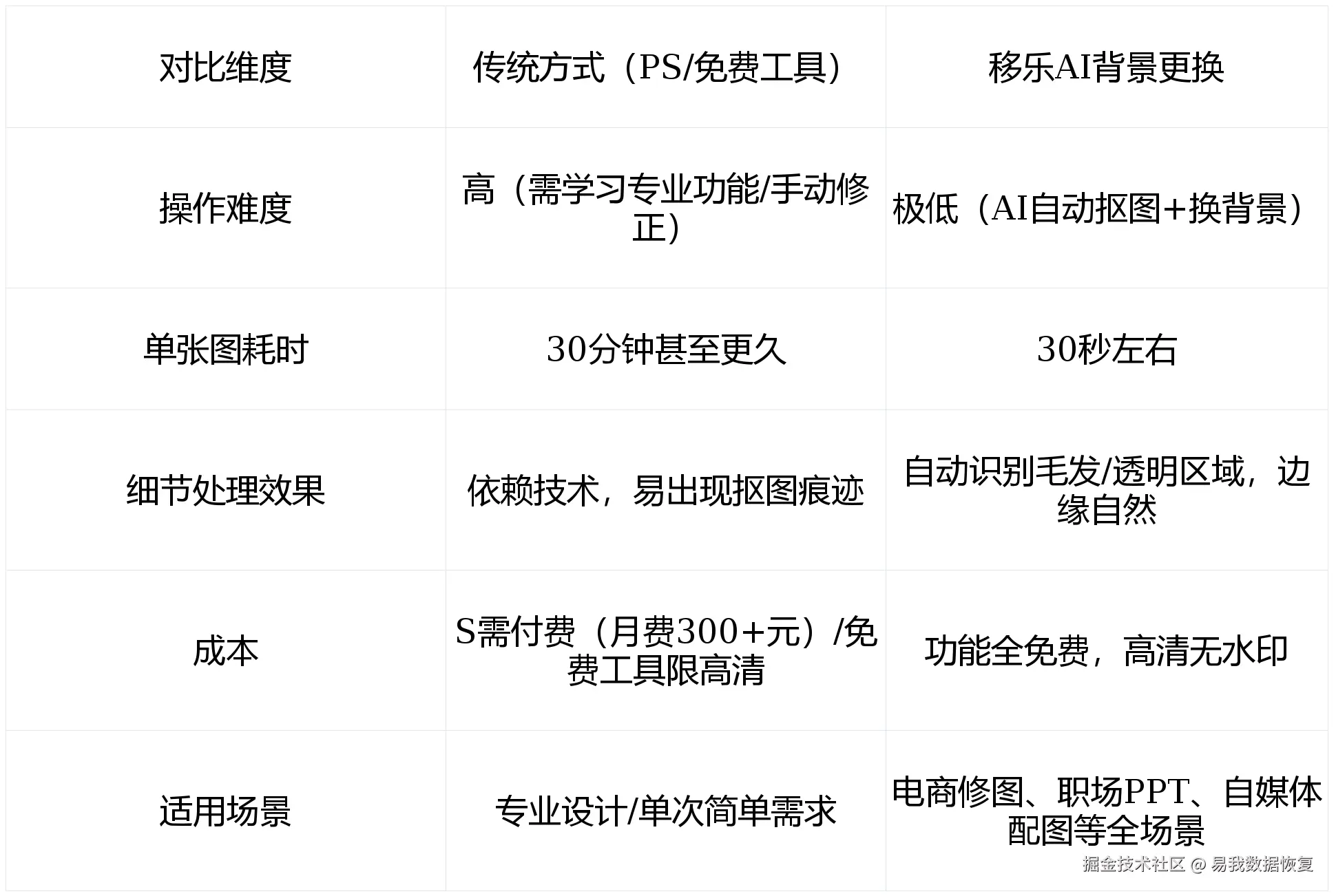 为了更直观对比,我们从“操作难度、耗时、效果、成本、适用场景”5个维度,整理了传统方式与移乐AI背景更换工具的差异: