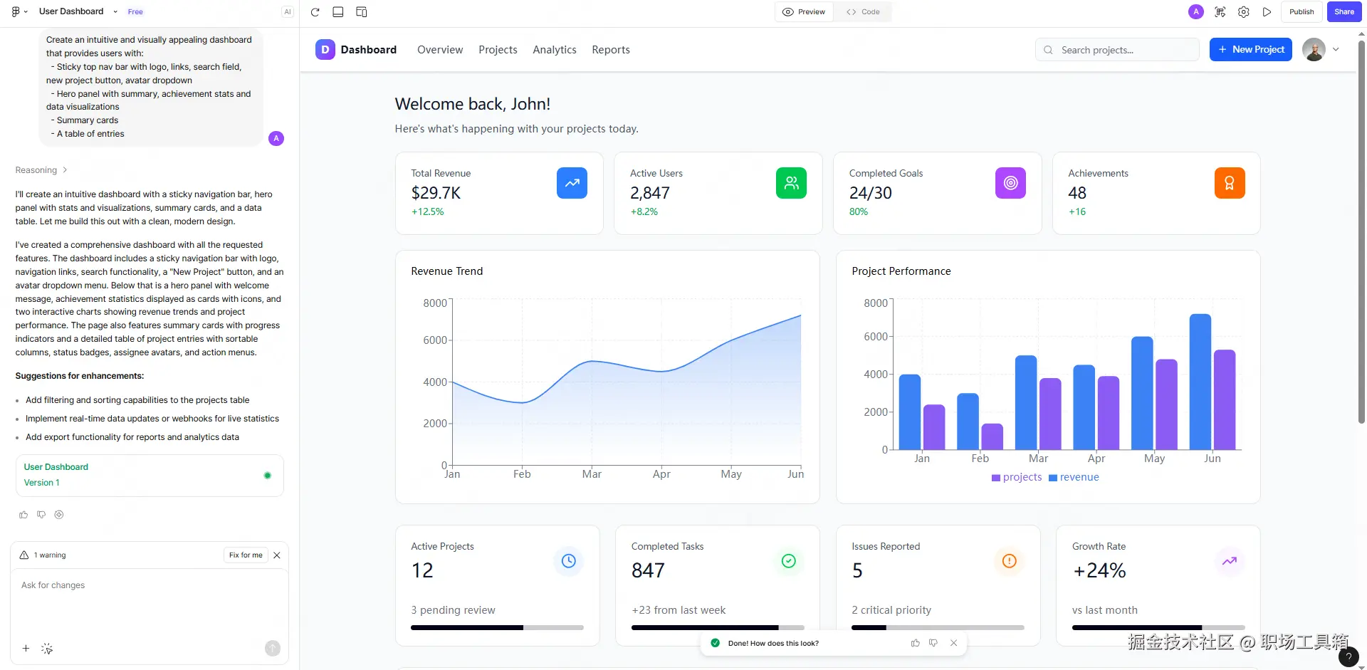 Lovable 的野心不在于画图,而是试图直接交付应用。它把生成的颗粒度从“单一组件”拉升到了“完整应用”的级别,试图打通前端界面和后端服务(比如 Supabase)的连接。