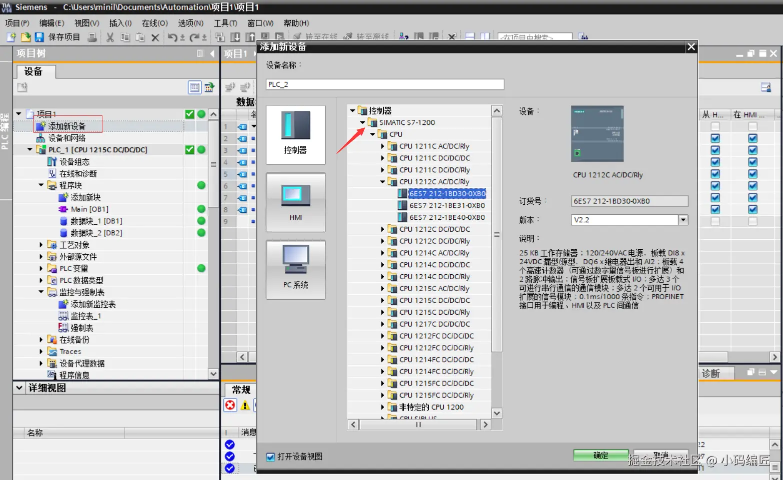 第一步: TIA Portal 新建项目,选择需要通讯的设备型号