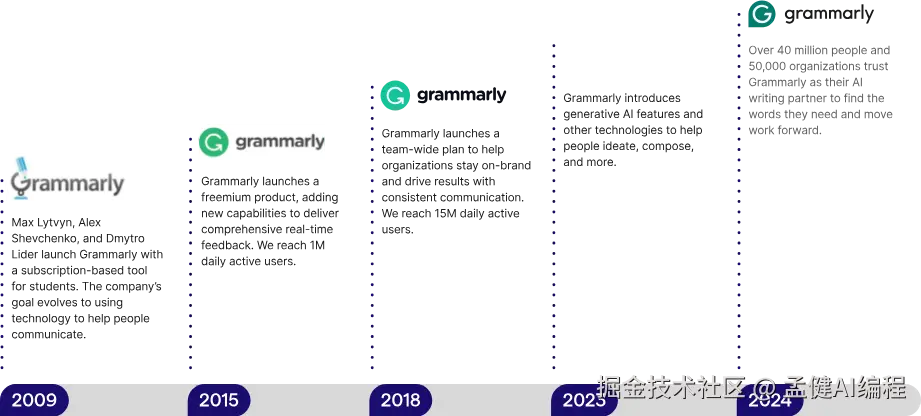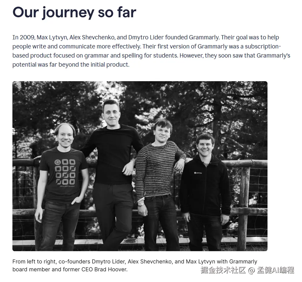 在 About 页面可以看到他们的创业故事,这家公司做的很早,2009 年开始由 4 个人初创,最初就是为学生群体提供语法和拼写纠正服务。