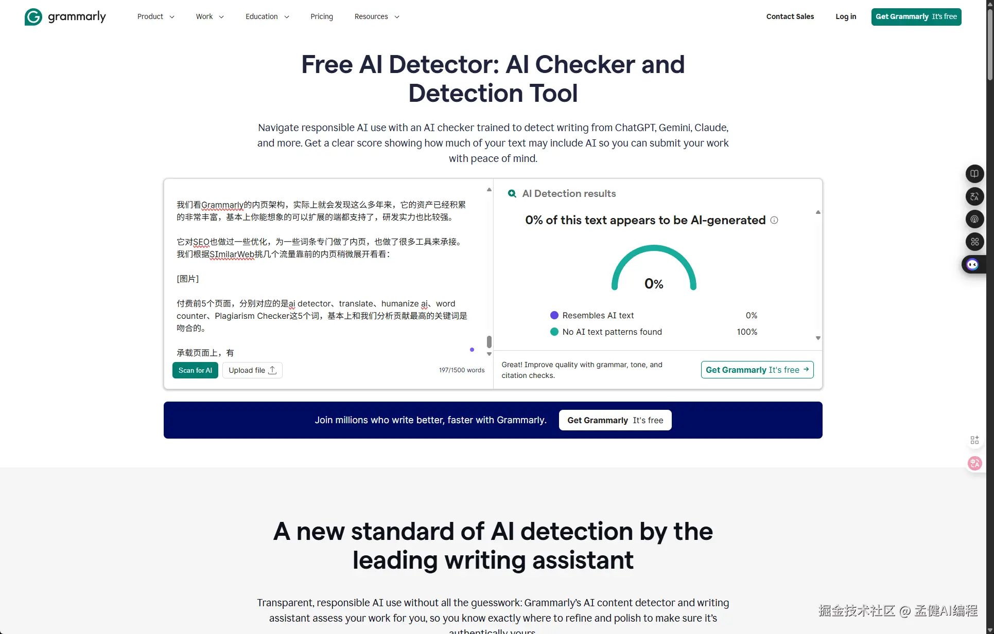 承载页面上,ai detector 是可以免费试用的,工具在首屏,我认为 Grammarly 是考虑了这个词的竞争激烈程度,所以把体验做的比较好: