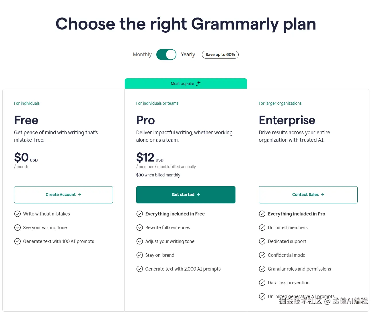 Enterprise 是没显示价格的,采取 contact 的方式做企业定制。这也是一种策略,其实会减轻用户心智负担,更愿意接受 Pro 的定价选择。