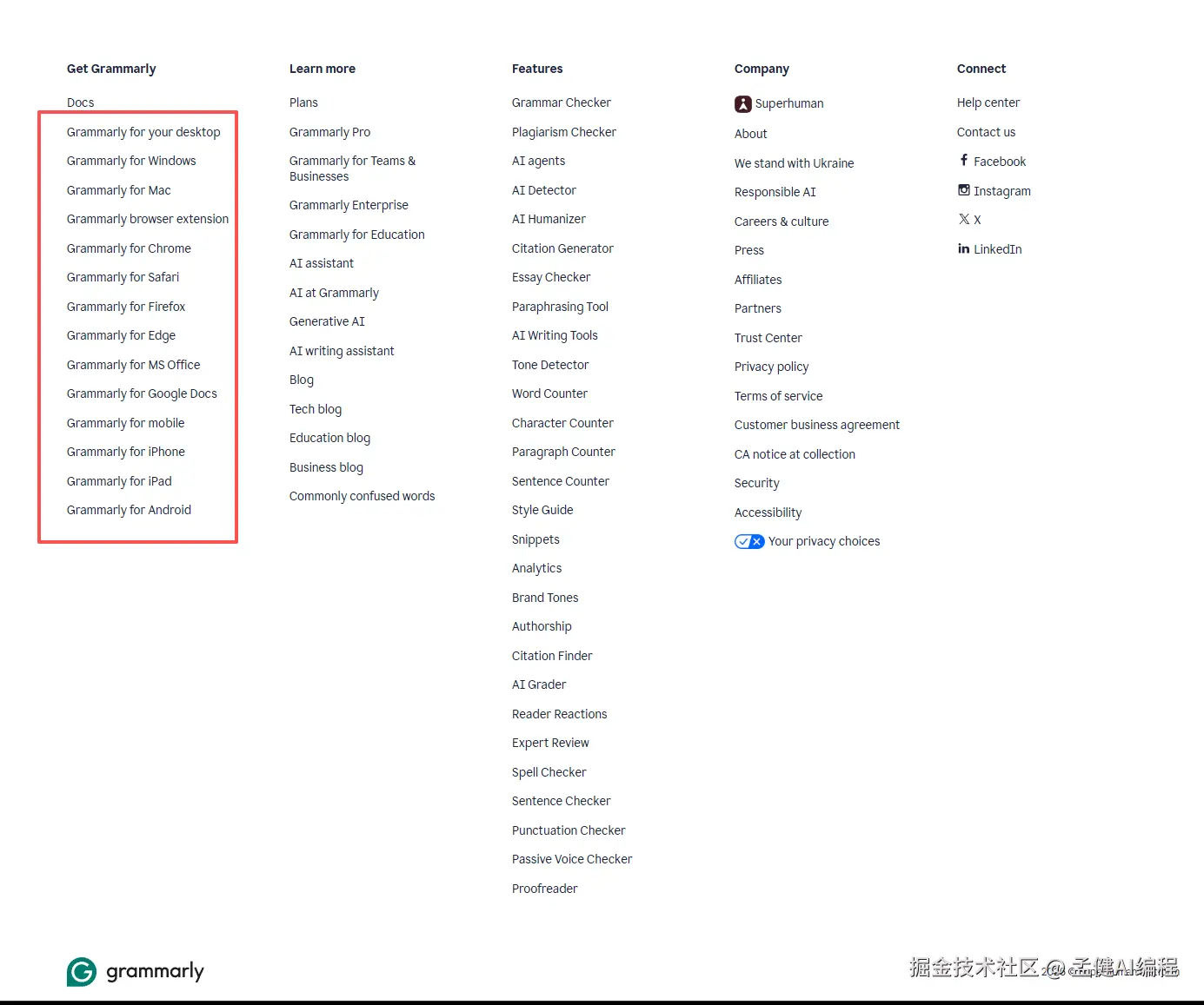我们看 Grammarly 的内页架构,实际上就会发现这么多年来,它的资产已经积累的非常丰富,基本上你能想象的可以扩展的端都支持了,研发实力也比较强。
