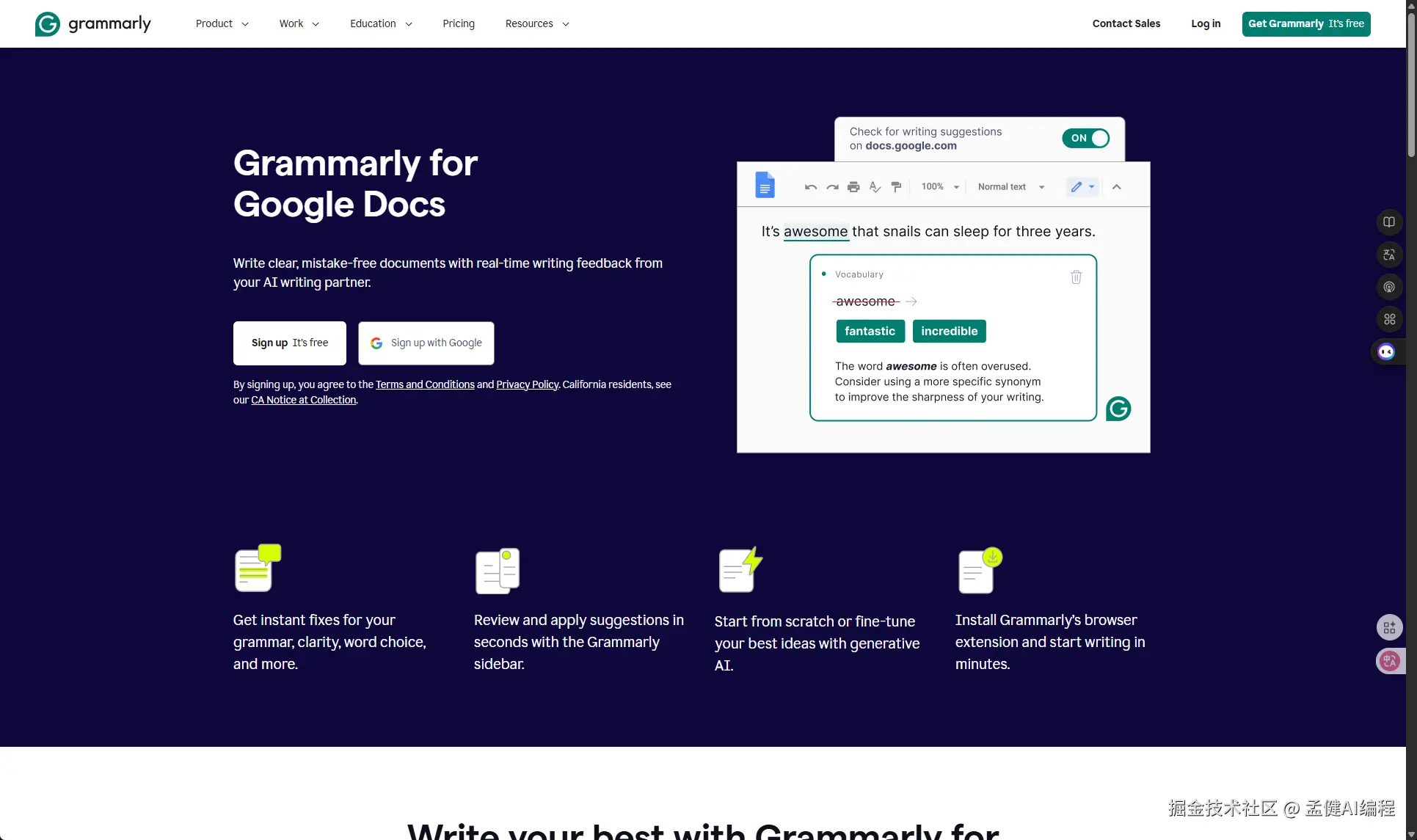 也就是说,它专门做了一个 google docs 落地页去抢这个词的流量,其实产品功能是浏览器插件,可以在 google docs 内完成 AI 写作的辅助功能。