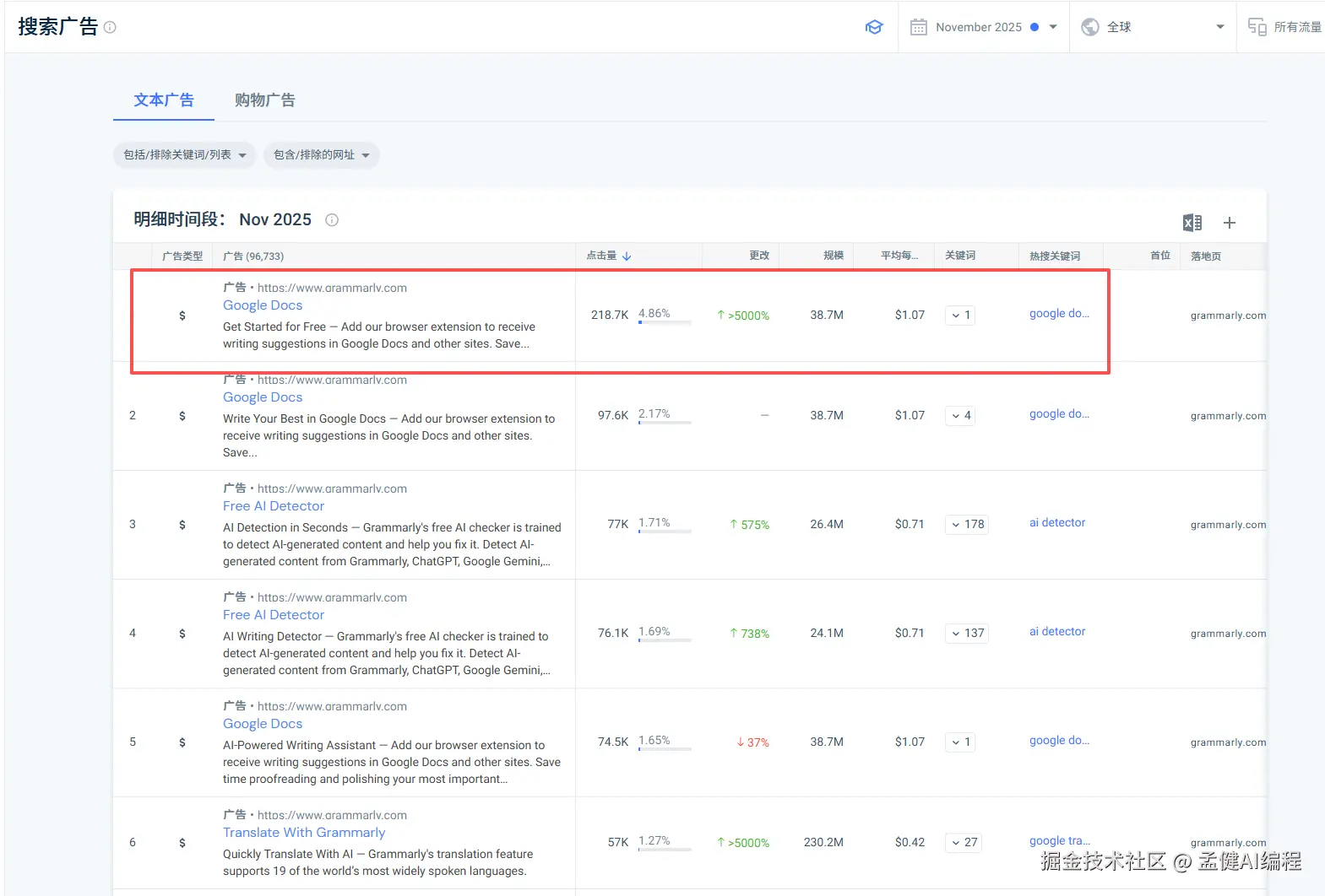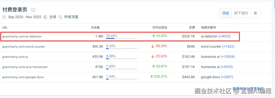 我们可以看到,其实 Grammarly 花钱买量,主要买的就是 ai detector 这个关键词。这市场实在太大了(千万搜索量的市场)。