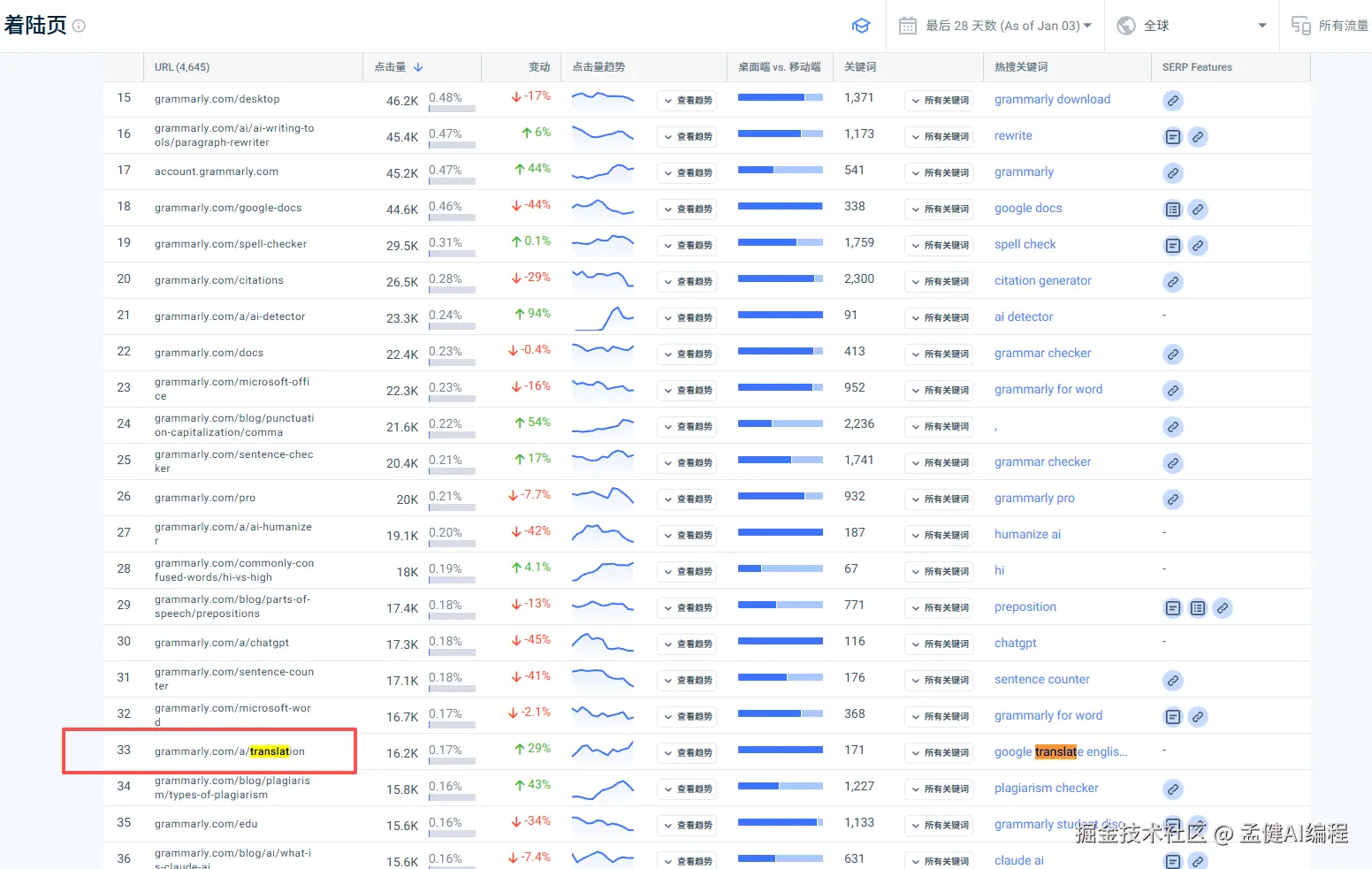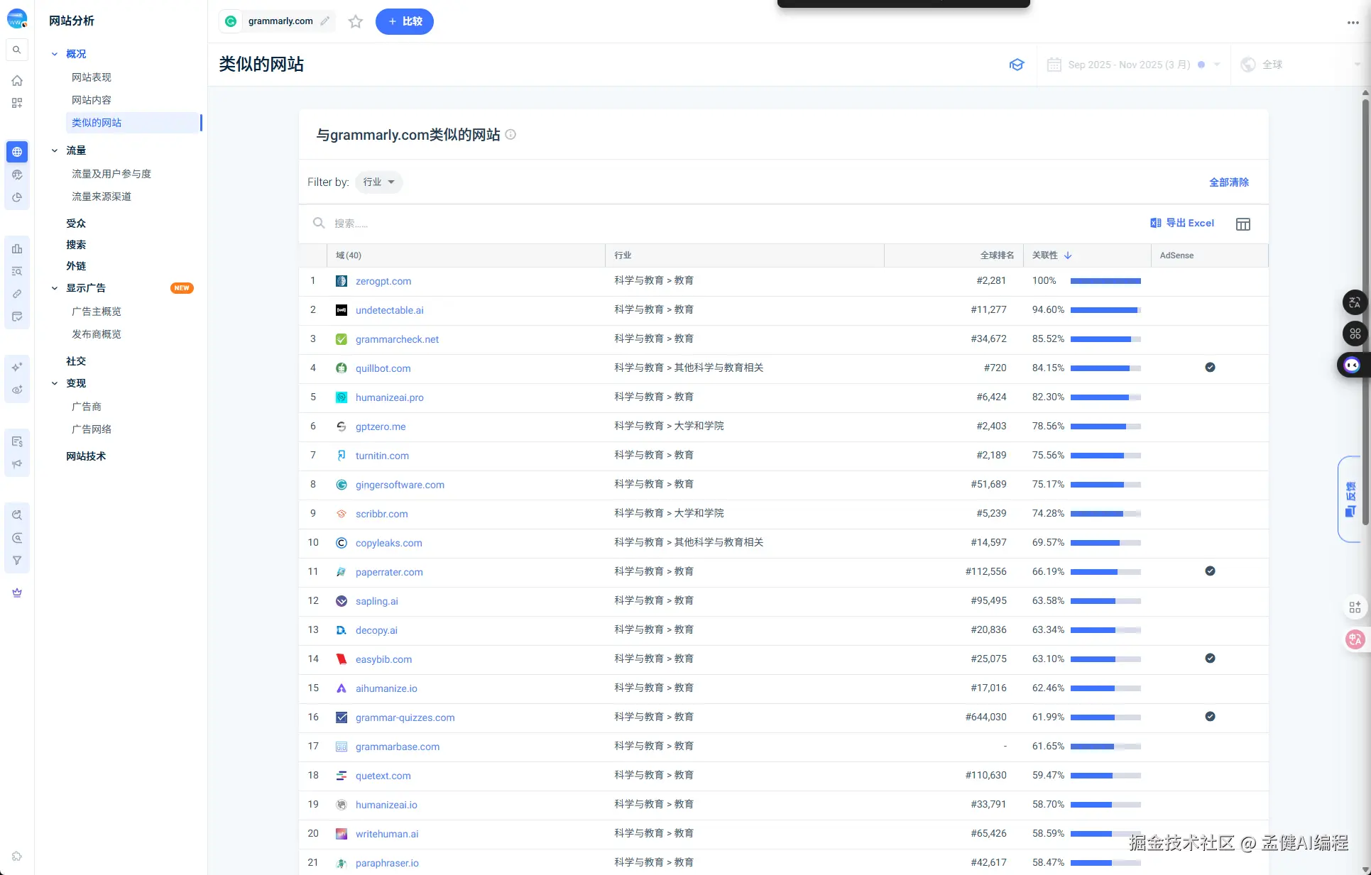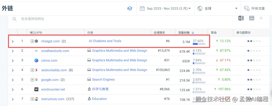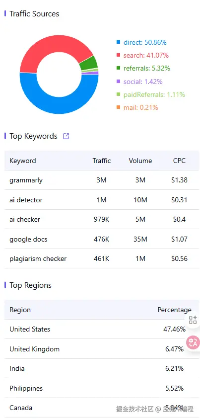 另外一方面,我们发现 Grammarly 最大的外链来源是 chatgpt,贡献了 300 万的访问量,这个不容小觑,我们现在做站,SEO 和 GEO 都要做,把自己权重做高,未来可能就是 GEO 的天下了。