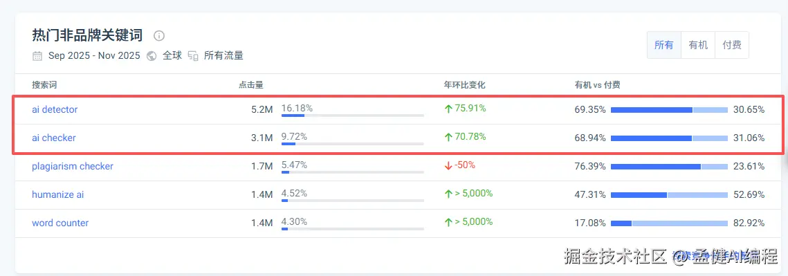 05 关键词:品牌词三百万/月,但它更狠的是吃“AI Detector”的盘子