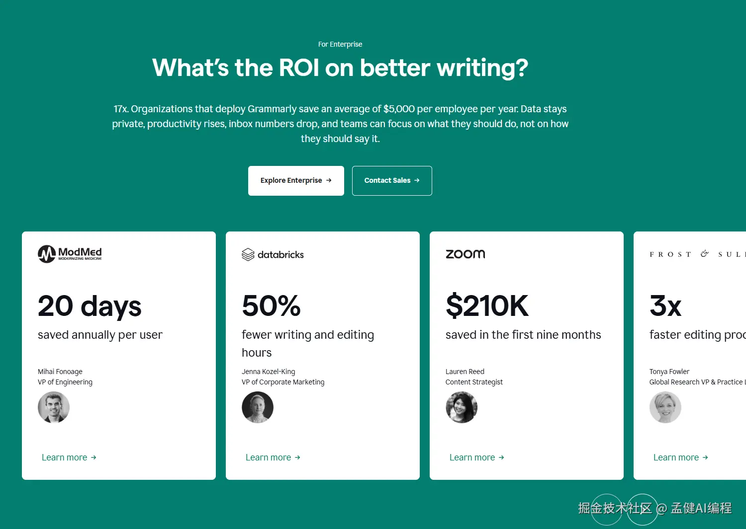 首页专门有一个企业 CTA 的模块,我觉得写的特别好。这基本上是给企业老板看的,直接清晰地测算出 ROI:17x。这是个震撼的数字。