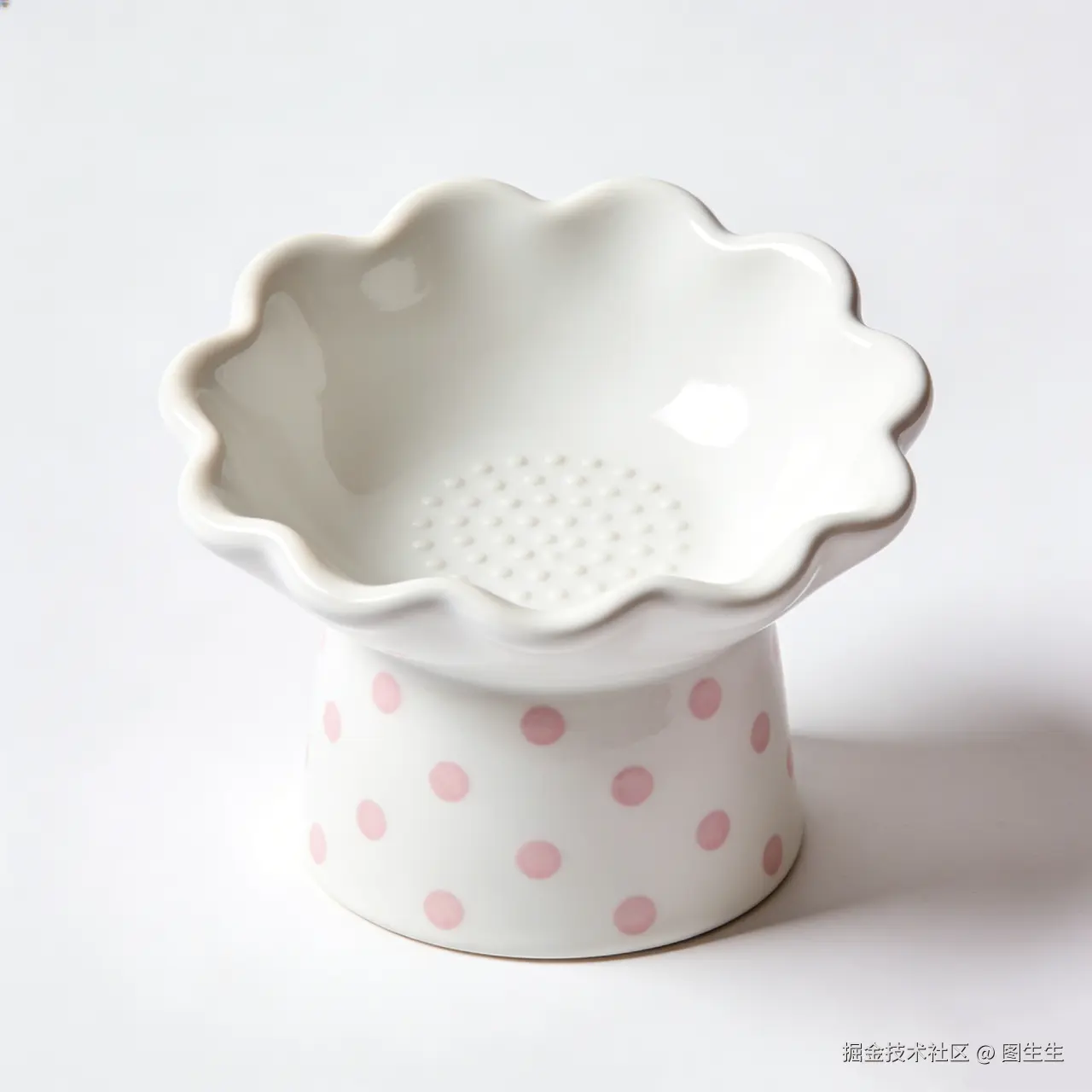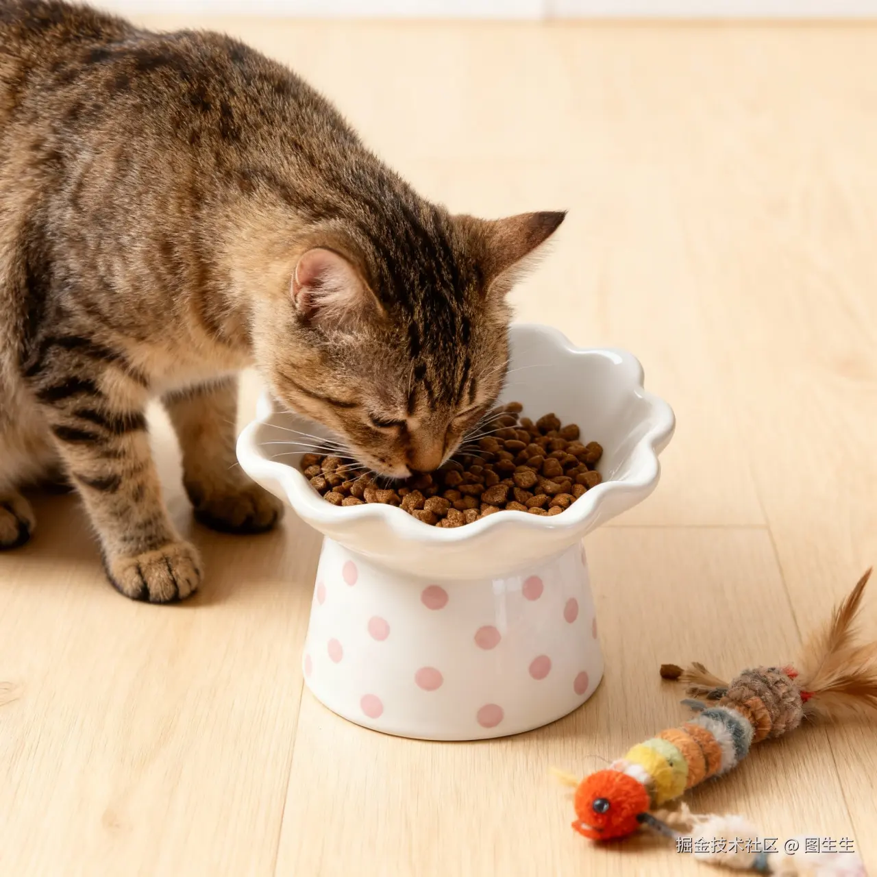 ▪原图描述:宠物陶瓷食盆,背景为纯白色,仅展示产品本身,无其他装饰元素,画面简洁但缺乏居家温馨感,无法让消费者直观感知产品的使用场景与适配性。