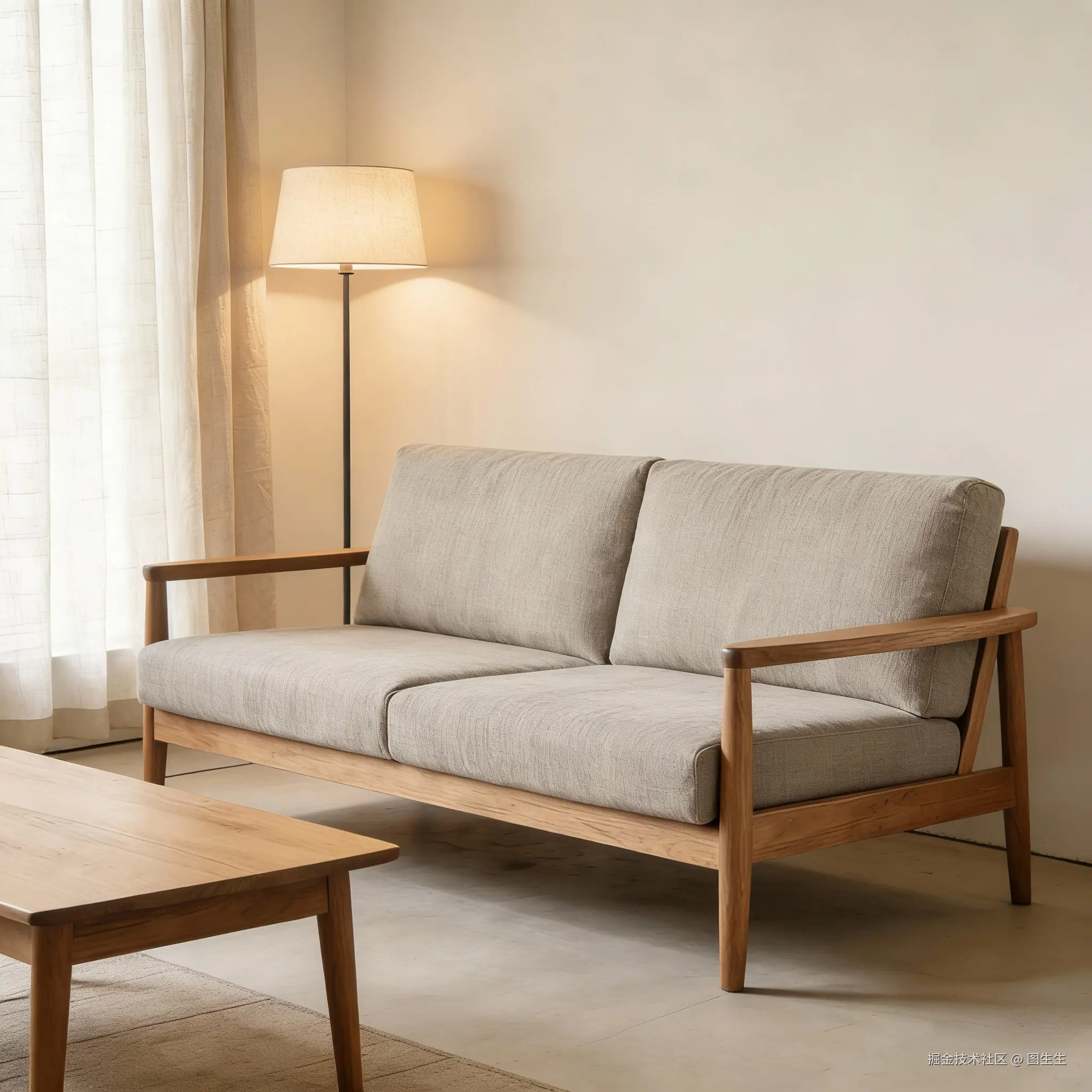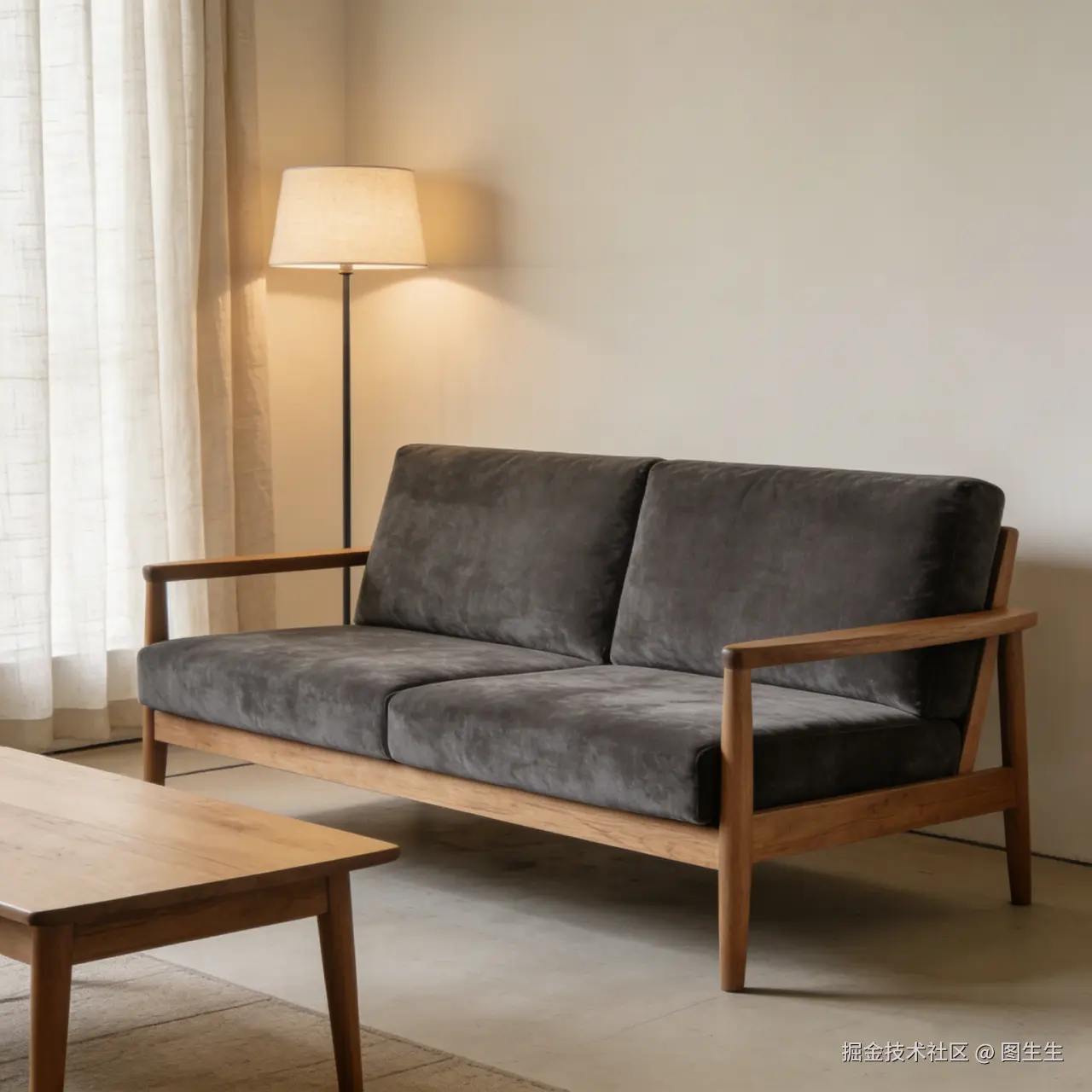 ▪原图描述:实木框架沙发主体清晰,坐垫与靠背为深灰色绒布材质,背景是简约的浅米色客厅场景,光线柔和,突出沙发的厚重质感与居家氛围。