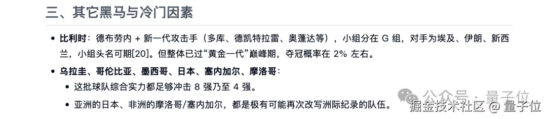 然后它会对每一支热门球队都进行一一阐述,包括所在小组情况、各阶段的出线概率和多角度原因,乃至可能遇到的隐患。