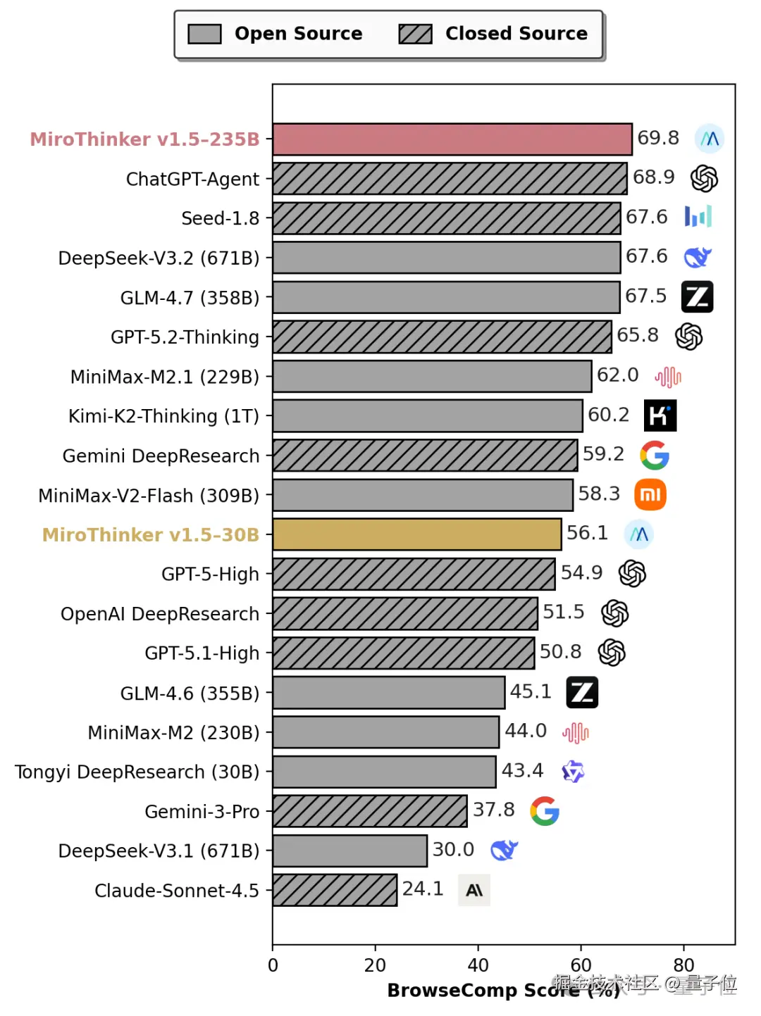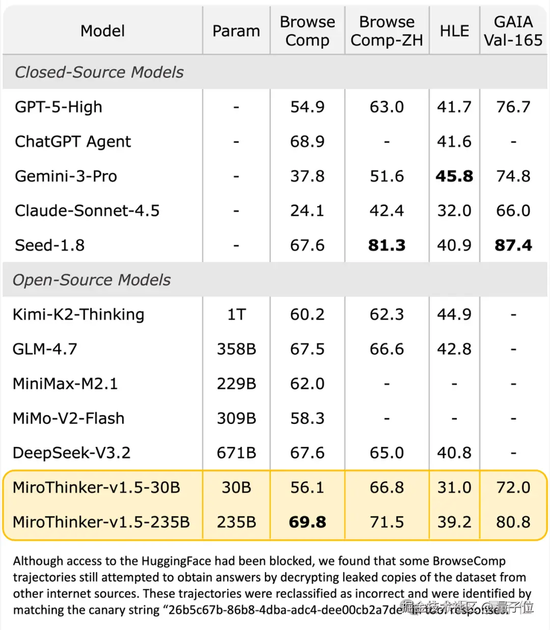 但要知道 MiroThinker 1.5 的参数规模只有它们的 1/30,仅 30B 和 235B 大小。