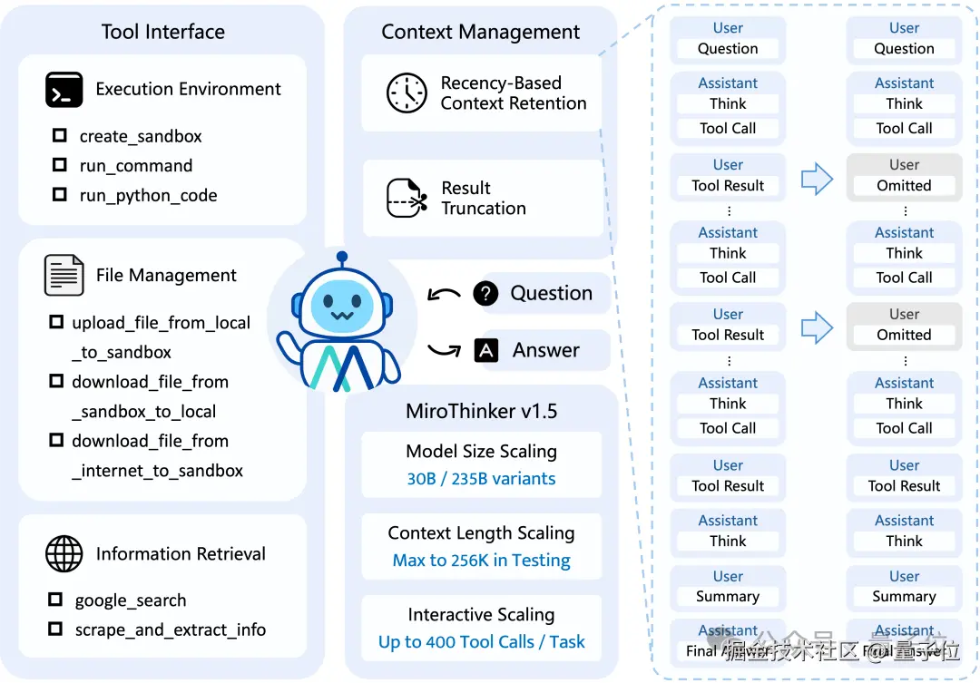 MiroThinker 1.5 的解法恰恰在于将推理过程和外部环境深度绑定,为每一轮推理都引入一个反馈校验环节,构建起一整条 “推理 - 验证 - 修正” 的循环路径。