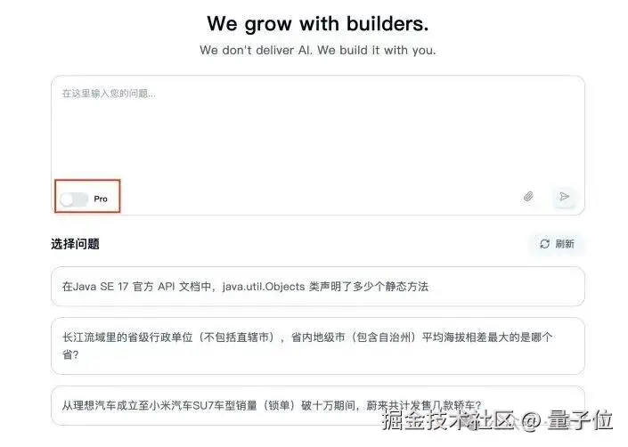 和常规的大模型对话窗口一致,点击左下角按钮即可升级为专业模式:内置更大尺寸的模型,同时支持文件上传。
