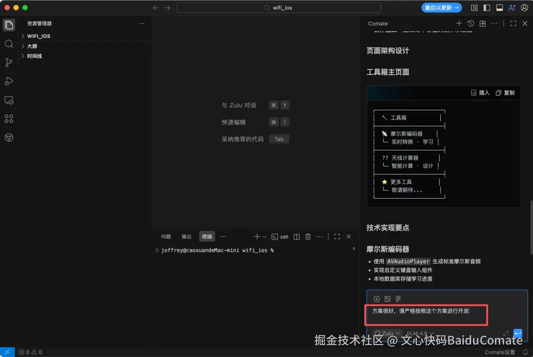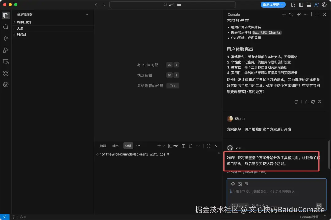 很快,Comate给出了它的方案,我对方案很满意,于是指令Comate,让它按照这个方案进行开发。