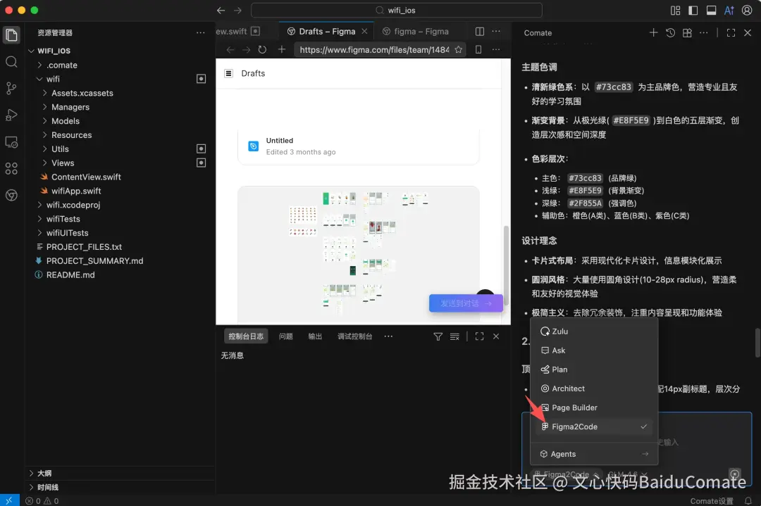 做独立开发的朋友都知道,最让人头秃的往往不是后台逻辑,而是把脑海里那个“好看的皮囊”完美落地到屏幕上。 调色、阴影、圆角、渐变、适配暗黑模式……这些事情重要,但是繁琐且很难一次到位。 在比赛现场,我没有在复杂的 SwiftUI 参数里打转,而是结合使用了 Comate 的 Figma 插件。我只需要做 2 件事: