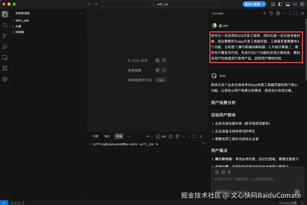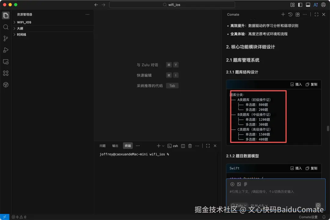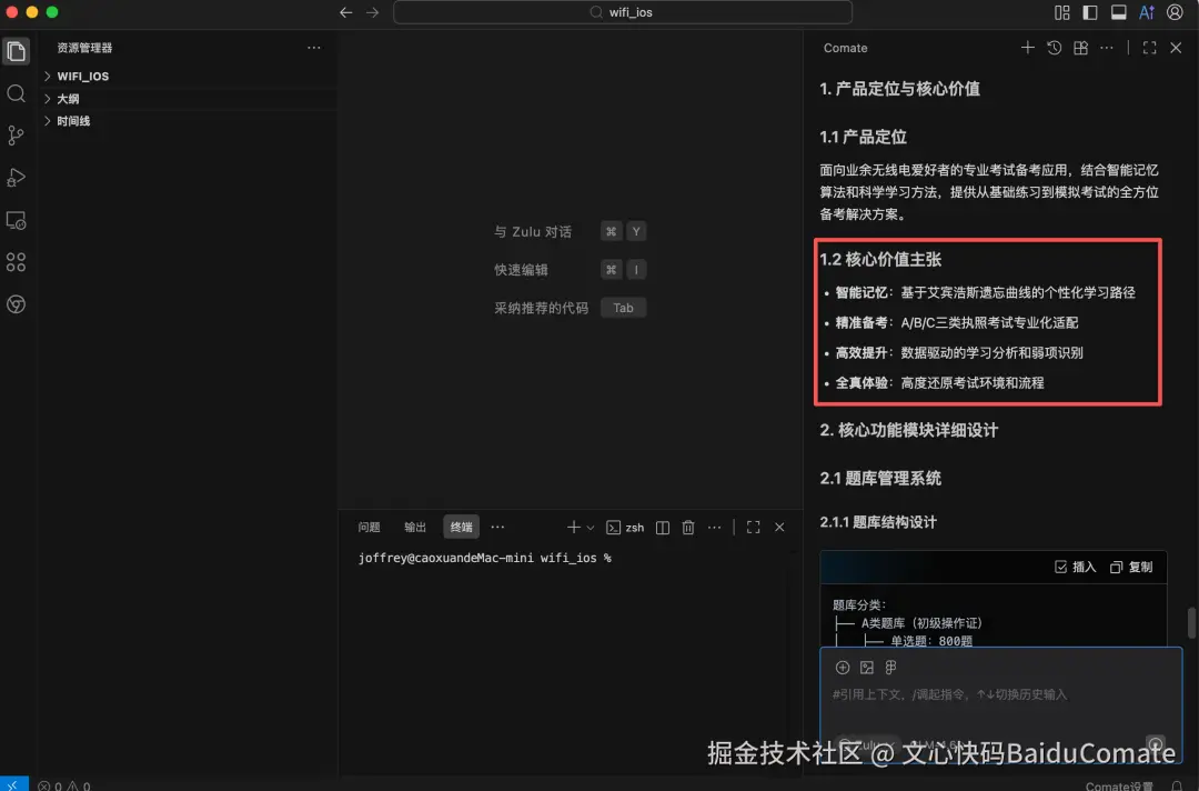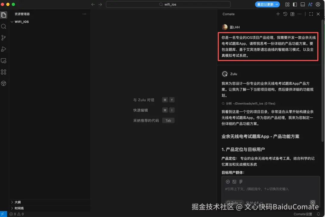 在过去,光是梳理题库逻辑、设计复习算法和规划模拟考规则,就能耗掉我一周的精力。但这次,我坐在电脑前,把产品构思的焦虑抛在一边,对百度的Comate下令: