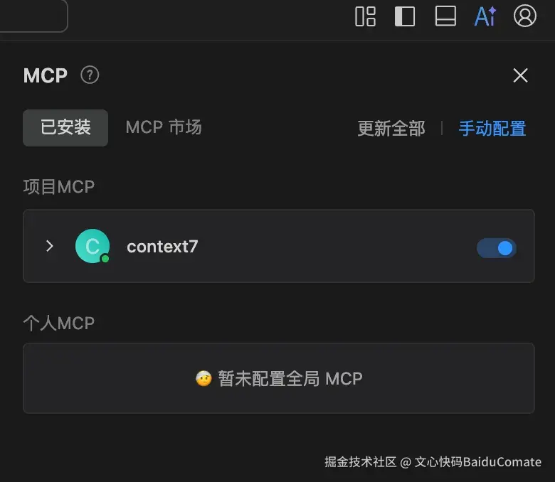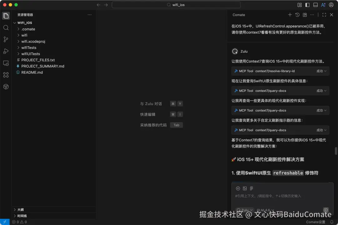 这时候,Comate的 Context7 (MCP) 功能成了我的“外挂”。 它不是在瞎猜,而是允许我让AI“联网”去查最新的官方文档。包括: