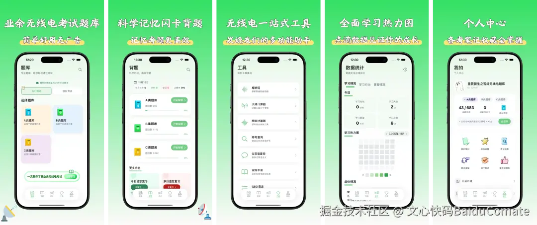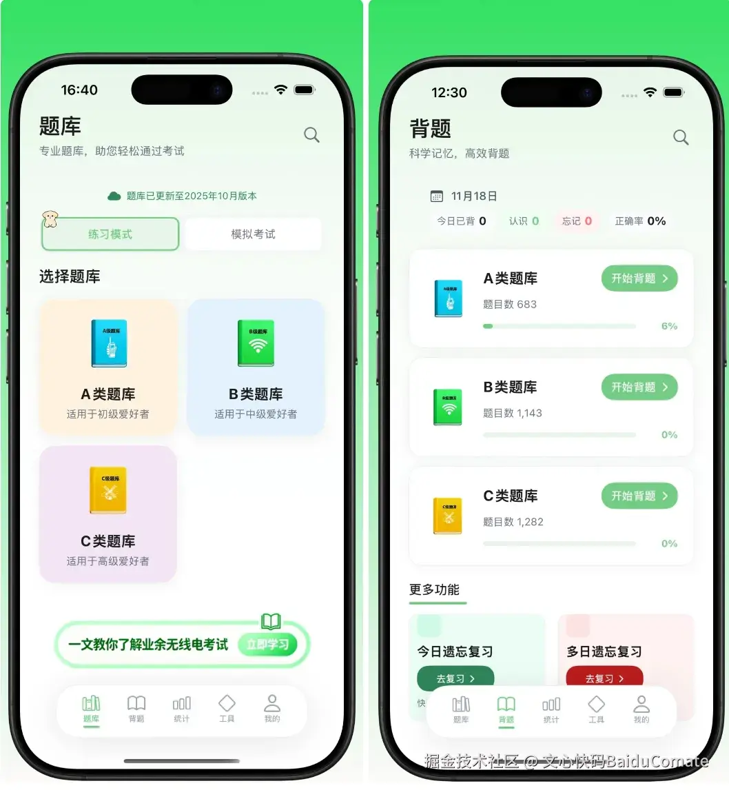 目前App已上架iOS,可以直接在iOS App Store“业余无线电考试题库”体验下这款由Comate开发的iOS App。