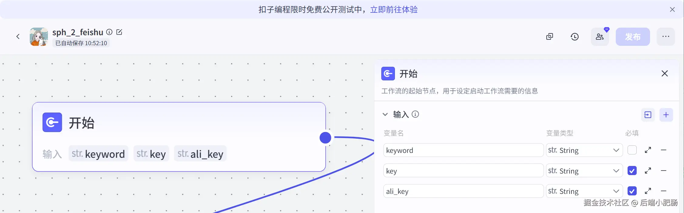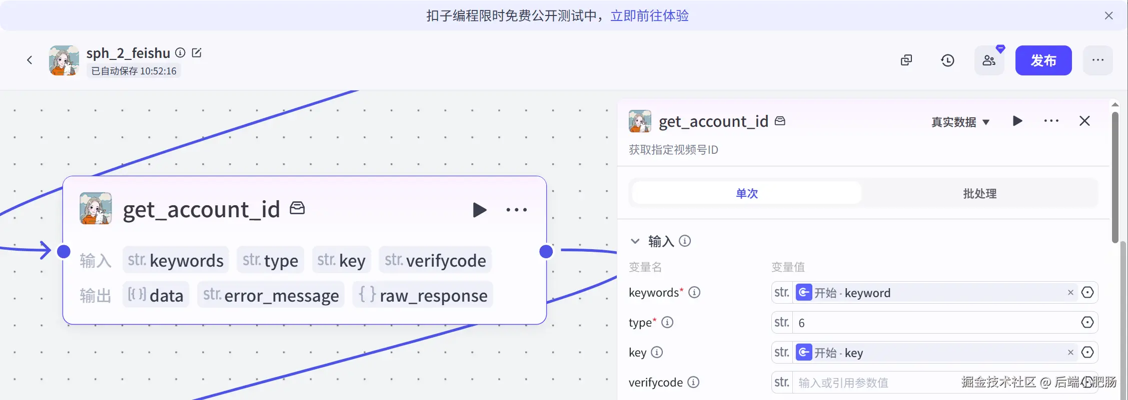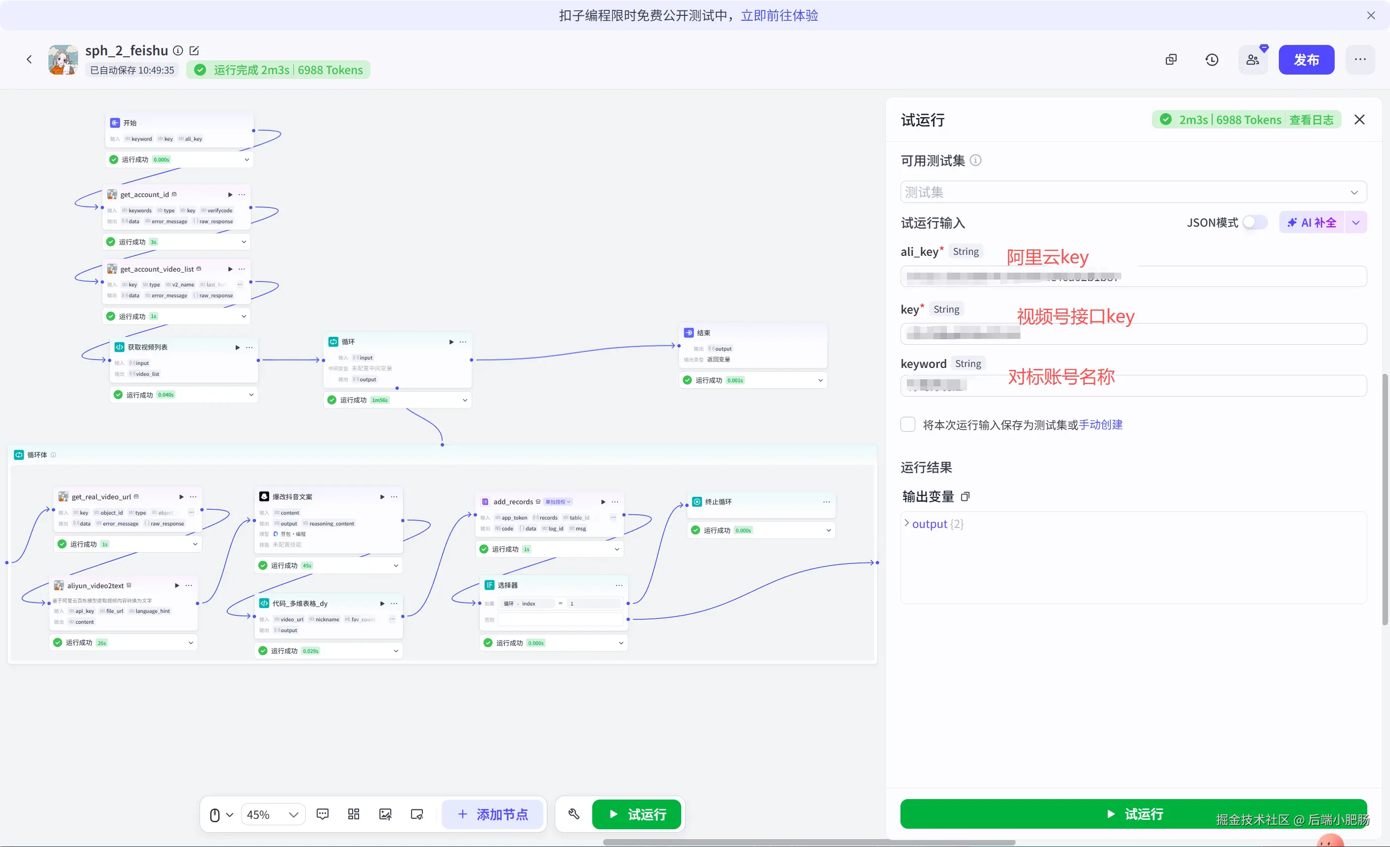 开始节点: 开始节点接收的参数有keyword(账号名称)、key(视频号接口key)、alikey(阿里云百炼key)。