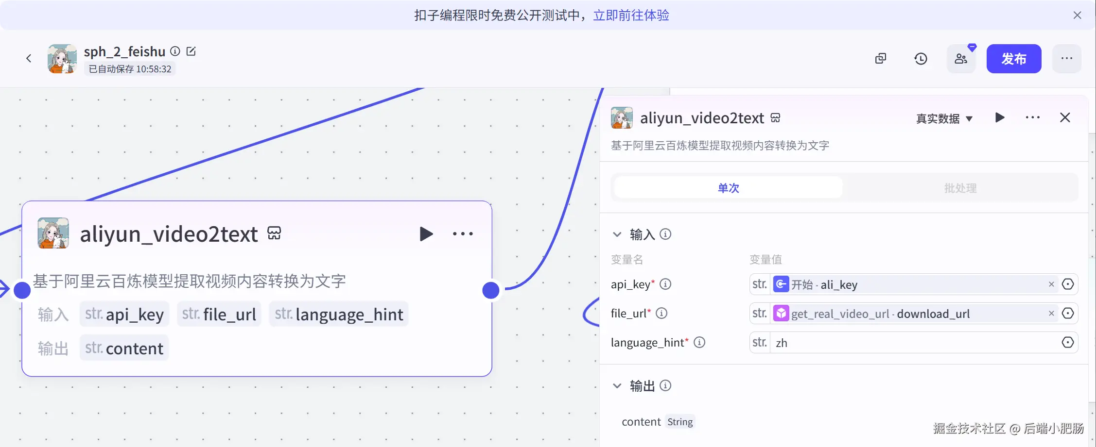 基于阿里云百炼模型提取文案: 这也是我开发的插件,插件市场搜索小肥肠即可找到并使用。它的作用是根据真实的视频地址提取文案内容。