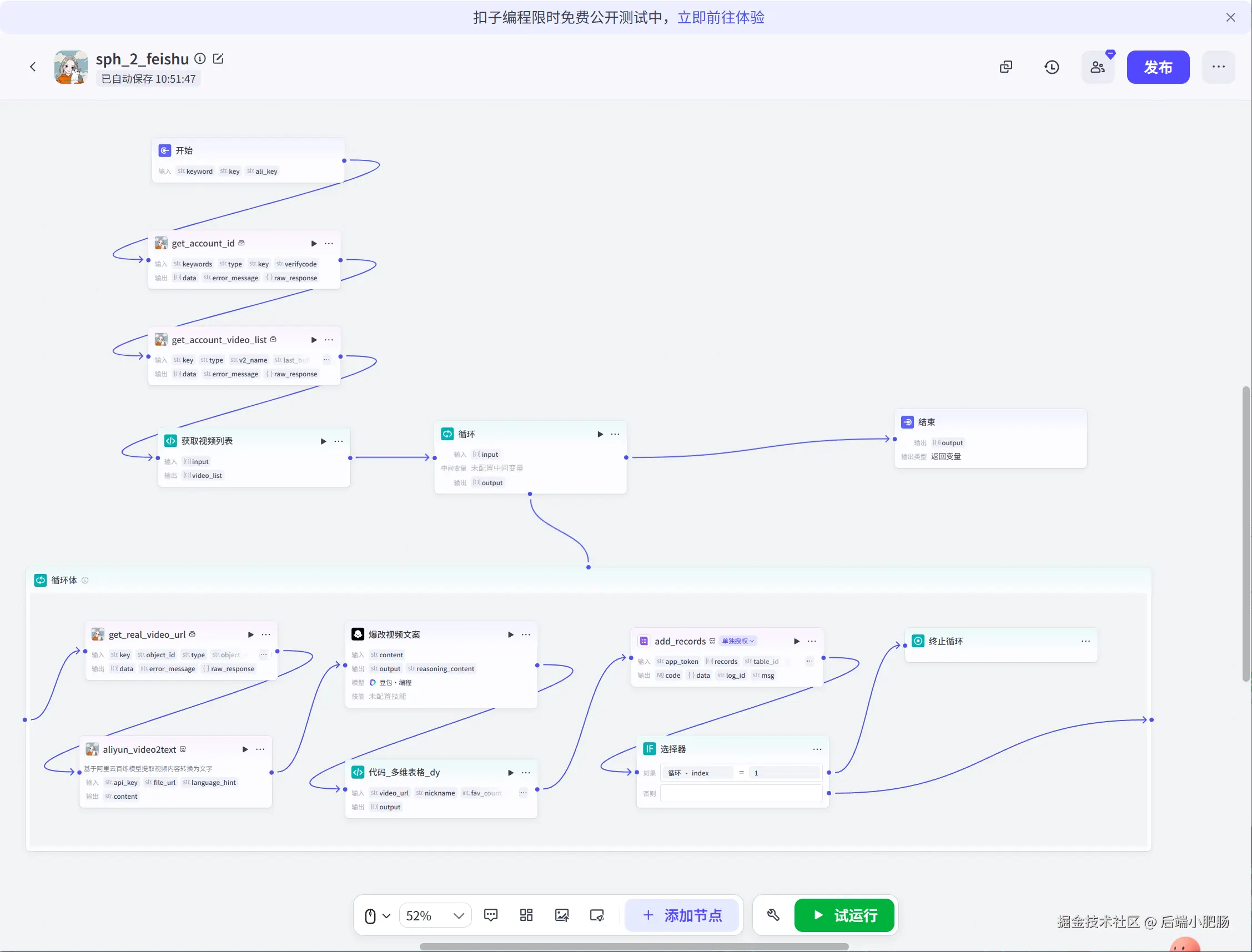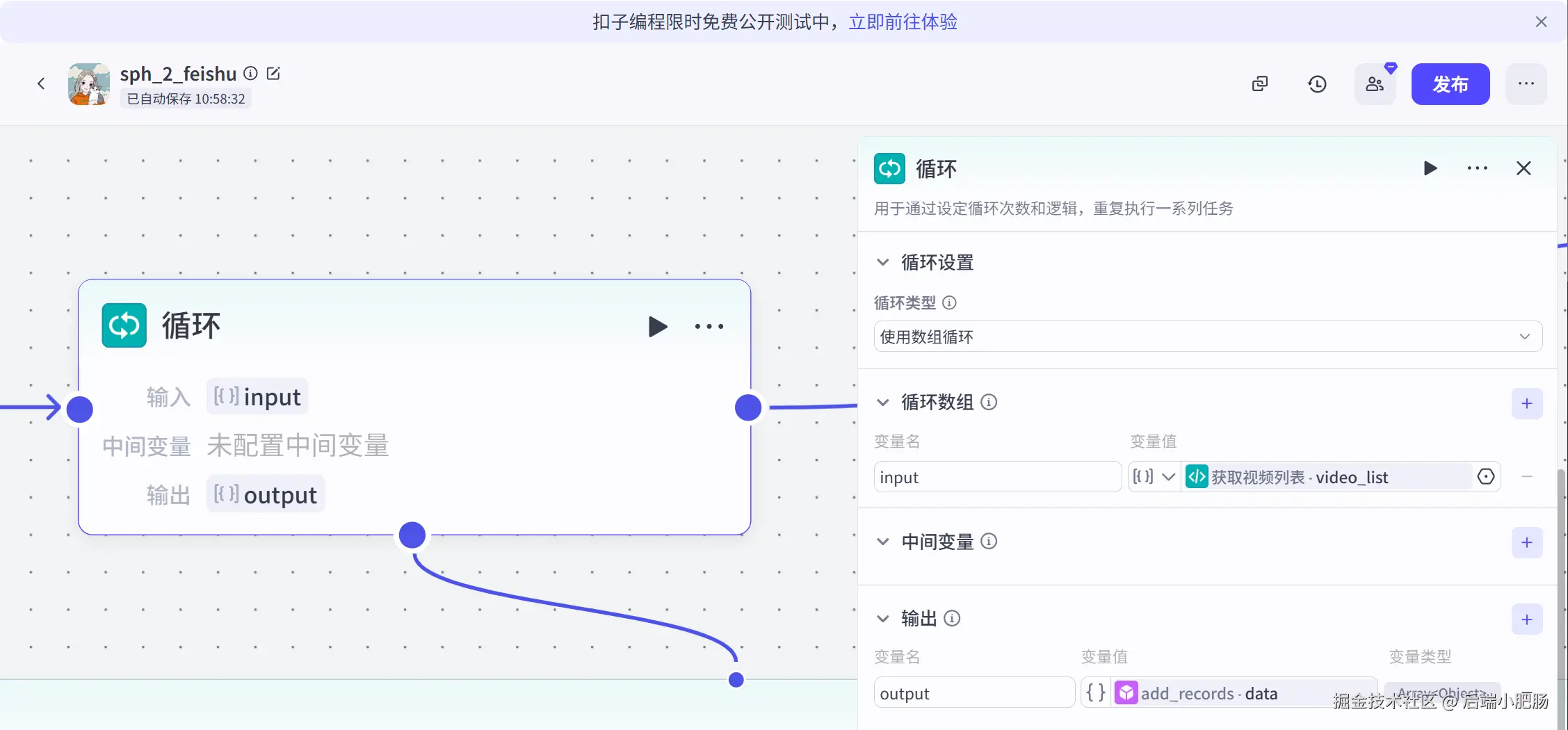 循环: 这个节点的作用是遍历视频列表中的每个数据信息,提取文案,进行二创,最后将数据规整后写入到飞书多维表格。