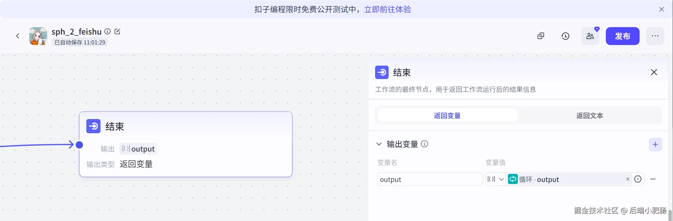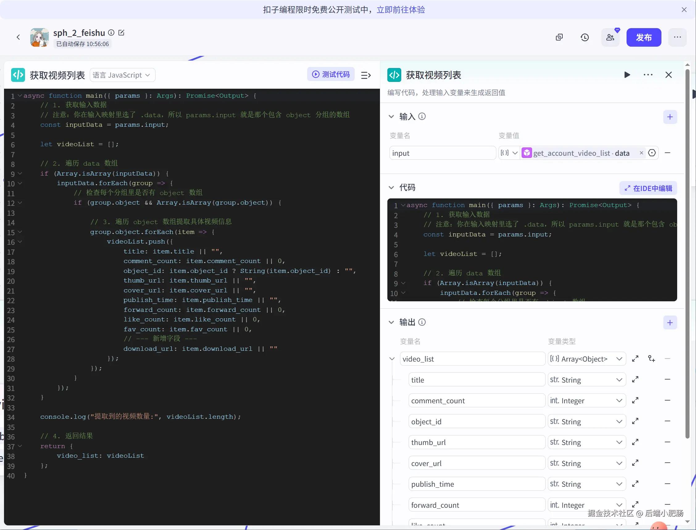 代码(规整获取的作品数据): 这是一个代码节点,它的作用是规整作品数据,输出规则的对象数组。如下图所示,我将标题、评论数、发布时间等核心属性进行了拼接整合,输出为规则的对象数组,方便后续处理。