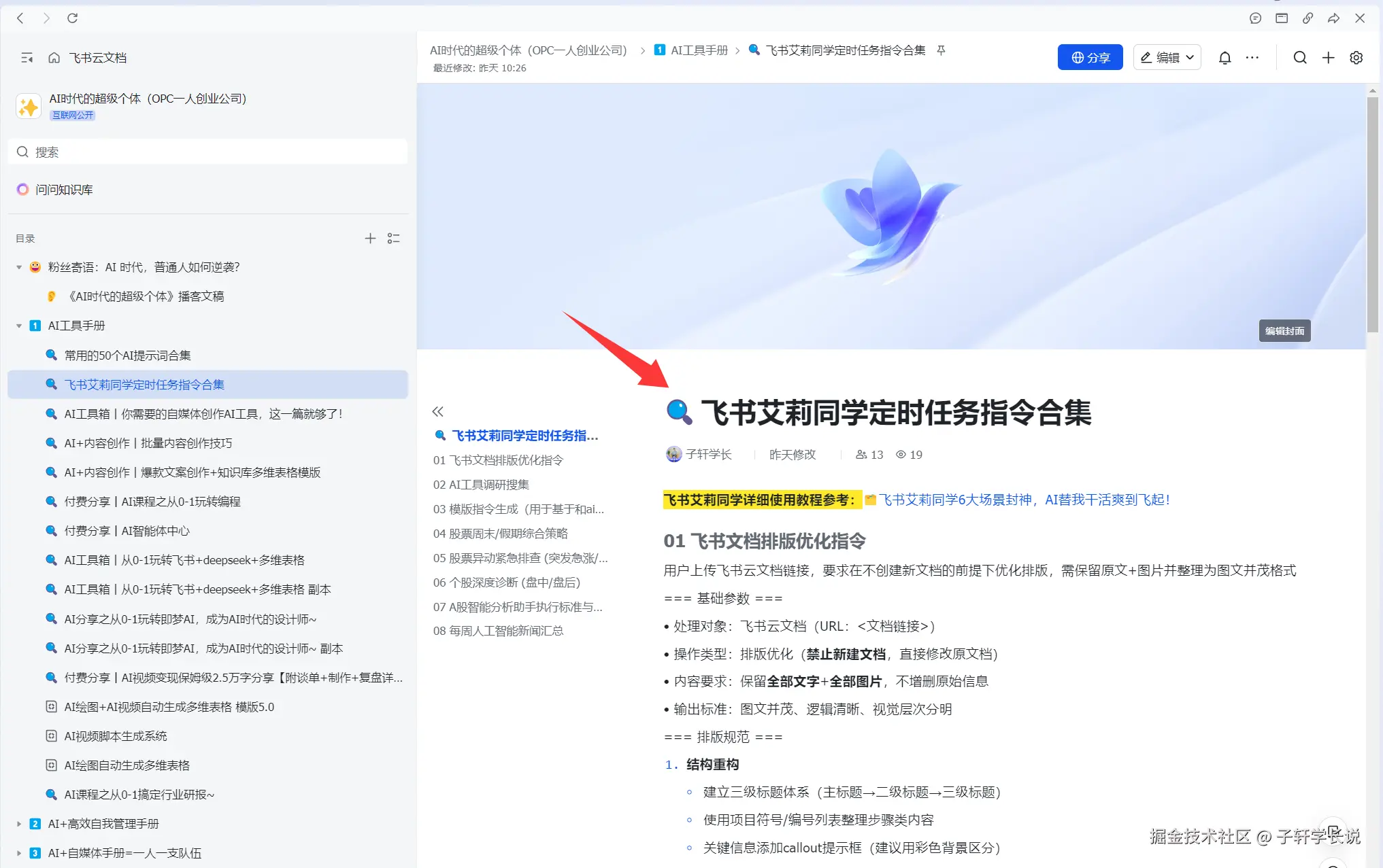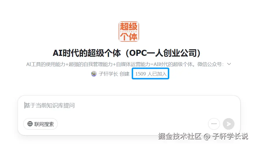 所以这个助手真的是强推了,日常自动化办公+定时任务,再加上现在飞书也在大力推知识问答功能,现在我把我的大部分AI使用的工具分享,以及飞书艾莉同学的一些常用指令,都放进了《AI时代超级个体》的知识库了,可以在知识库里提问:艾莉同学指令,让AI发给你,未来知识库也会帮助更多的人也走向OPC一人创业,目前已经有1500人加入了,期待你也成为其中的一员。