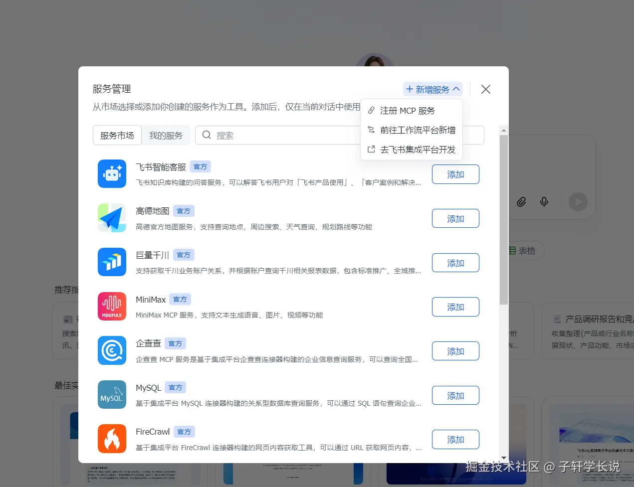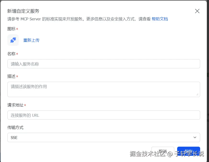 - 主页点击工具,点击添加,点击MCP,点击新增服务,点击注册MCP服务
