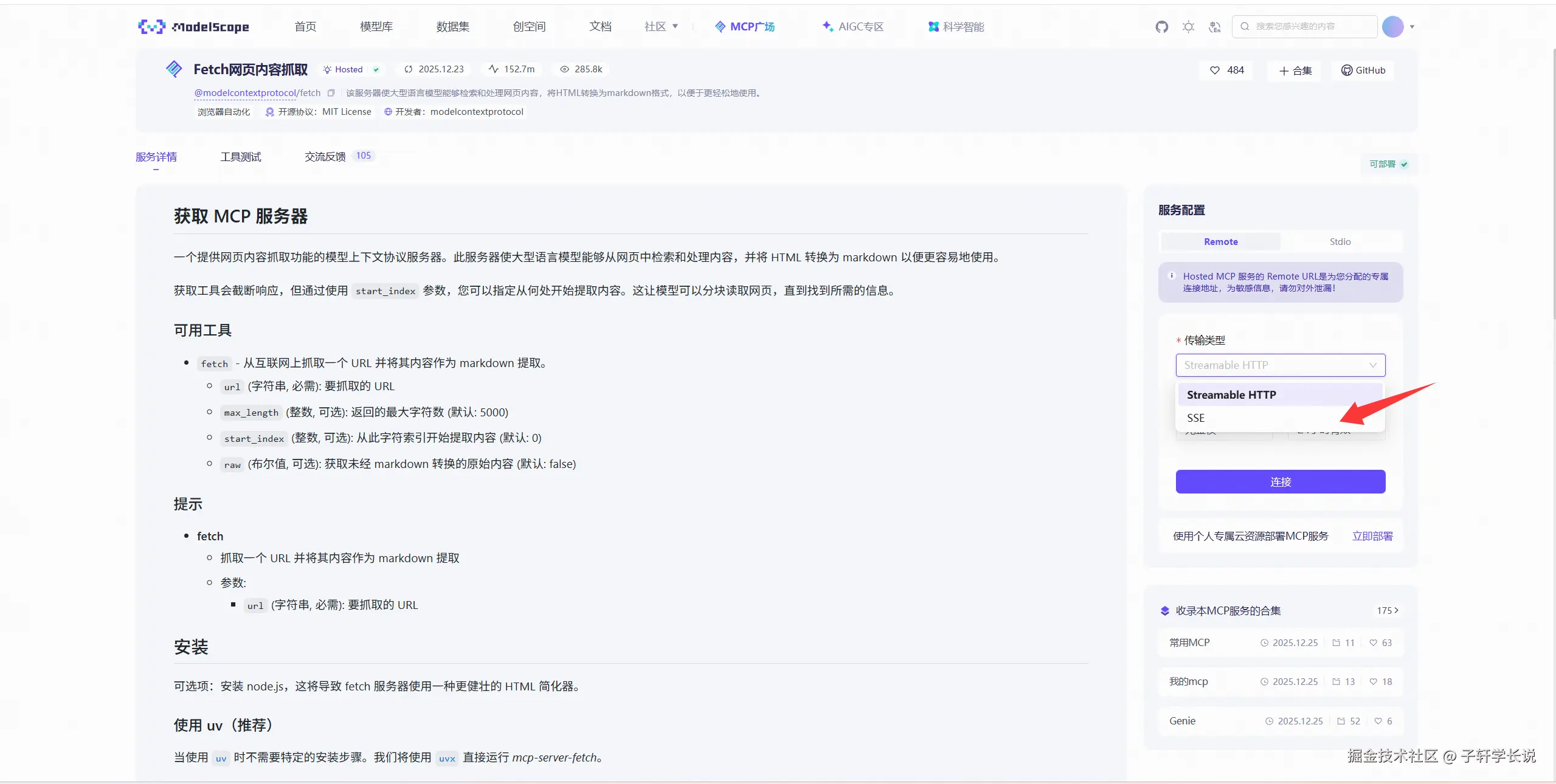 - 进入工具页面,右侧点击传输类型为sse,时效选择长期使用,点击连接