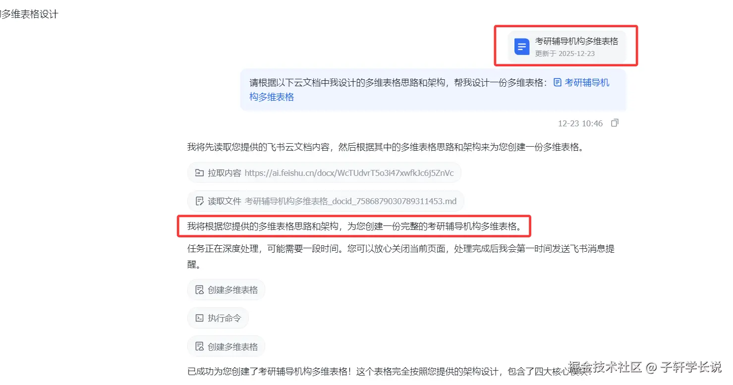 比如同样我都可以直接先把多维表格的要求生成云文档,然后生成让它按照云文档要求设计一份表格。