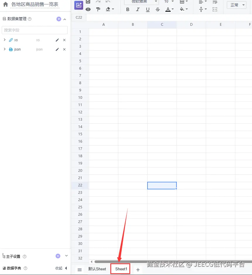 新创建一个报表时,系统会自动创建一个默认 Sheet 页,作为报表的起始页面。
