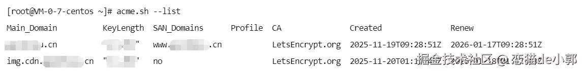 可以看到,实际操作起来还是挺简单的,而且是在你自己的服务器,安全问题也比使用第三方平台或者面板更可控,之后,你也可以通过以下命令查看 acme.sh 管理的证书状态。