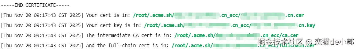 申请颁发成功后, acme.sh 会告诉你证书路径一般在: