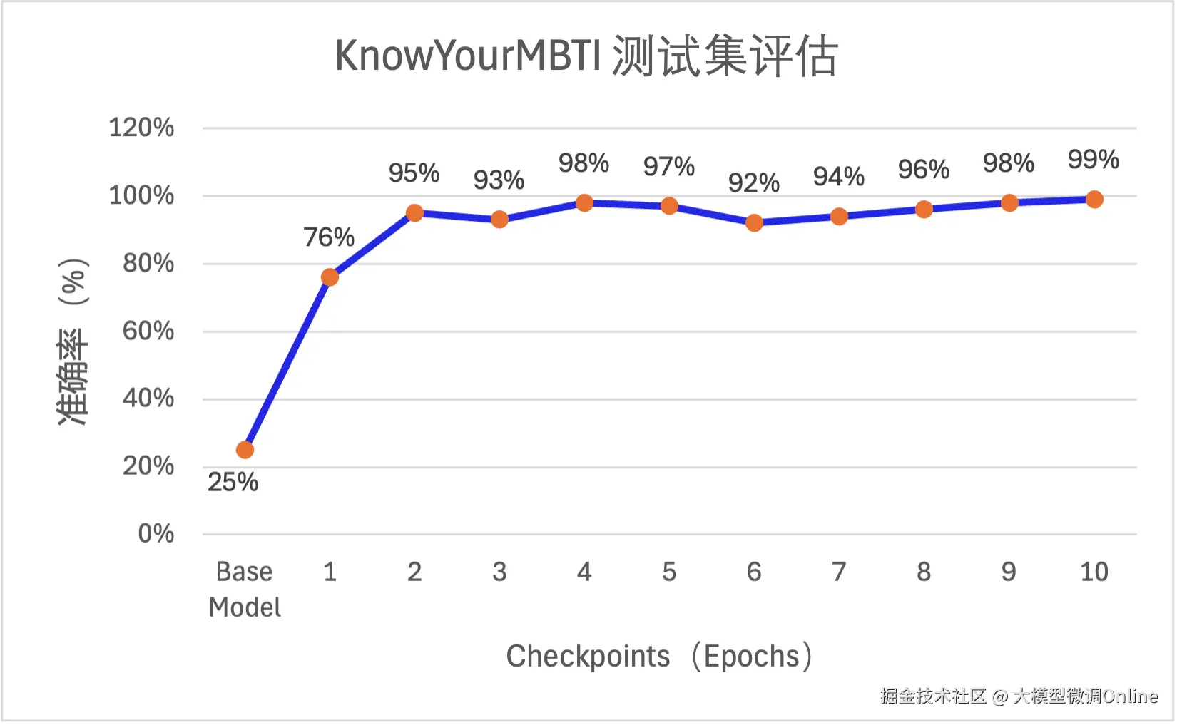 ● 效果:我们一共训练了10个epoch,从MBTI 标签预测的准确率看,大致在第4-5个epoch就已经达到较为高的水平,后续在测试集上的表现提升不显著,还存在过拟合的风险。最终,我们选择了第4个epoch的checkpoint进行展示。