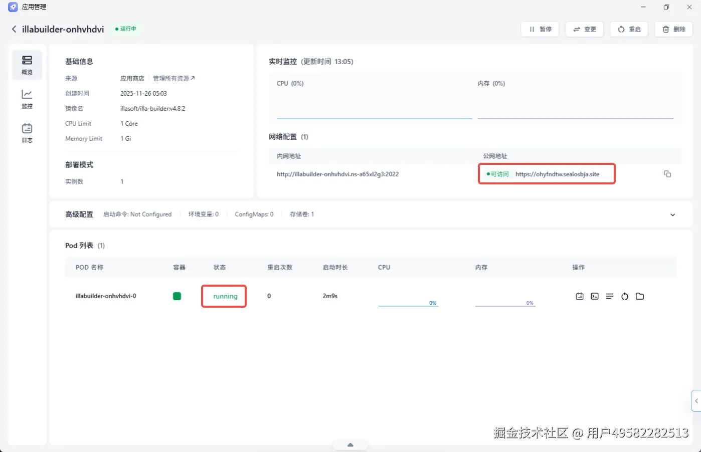 Sealos的自动化系统会为你完成所有工作。在大约 2分钟 的等待后,当应用状态变为绿色的Running,你的私有低代码平台就已经成功上线。点击外网访问地址,开始你的高效构建之旅。
