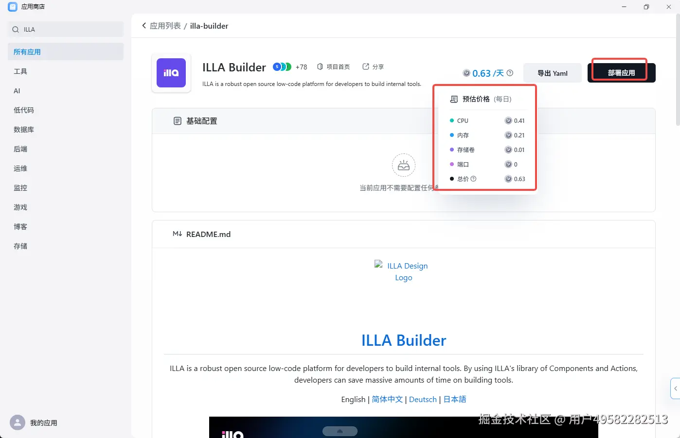 你会惊讶地发现,部署这个强大的低代码平台,你不需要填写任何配置。Sealos已经将ILLA所需的所有组件和配置都打包成了一个模板。你只需要欣赏一下它极低的单日预估价格,然后直接点击右上角的“部署应用”按钮。