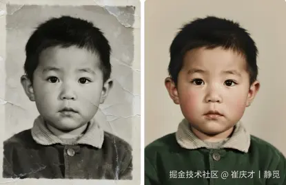 提示词:请修复这张充满划痕的黑白老照片。移除所有污点和破损,大幅提升清晰度,并进行自然、逼真的上色。