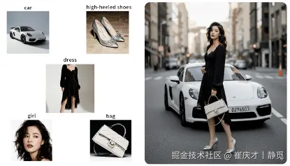 提示词:一位模特站在一辆白色的车前面摆拍,场景为街区路面,两边是建筑。她穿着黑色连衣裙和白色高跟鞋,一手拎着白色的包。