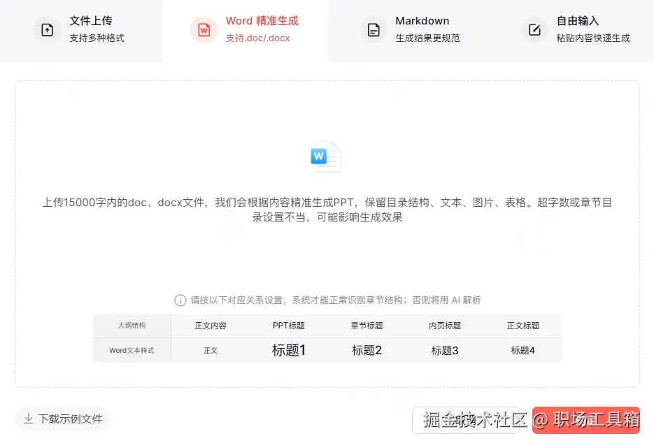 博思AIPPT最大的亮点在于其强大的自然语言处理能力,特别是在文档转PPT这一场景下。很多时候,年度规划已经以Word报告、Markdown笔记或者思维导图的形式存在了。传统的做法是人工复制粘贴,而博思AIPPT允许你直接上传这些文件。