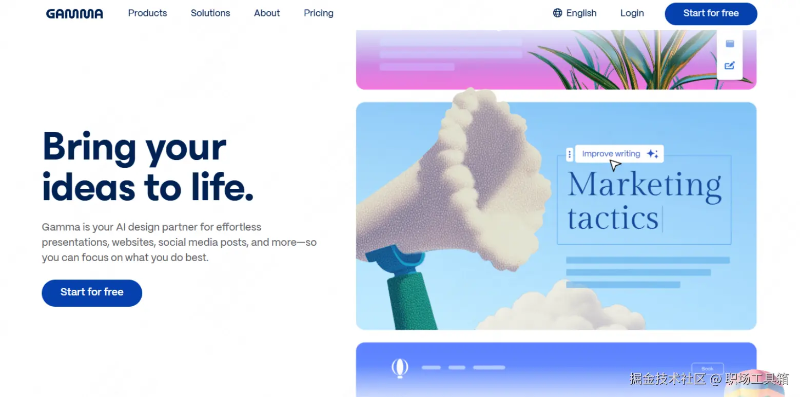 Gamma非常适合对外路演、融资演讲或创意类部门的内部规划。它的动态效果和非传统布局能给观众带来强烈的视觉冲击。但必须注意的是,虽然Gamma支持导出PDF和PPT,但导出后的效果会失去原有的交互性,且排版可能会错位。因此,如果你的年度汇报环境允许直接投屏网页,Gamma是绝对的王者;如果必须提交静态文件归档,请慎重选择。