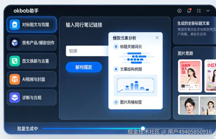 可能有宝子会问,市面上AI图文工具不少,为什么偏偏推荐okbob助手?核心就在于“效率高+爆款基因足”。