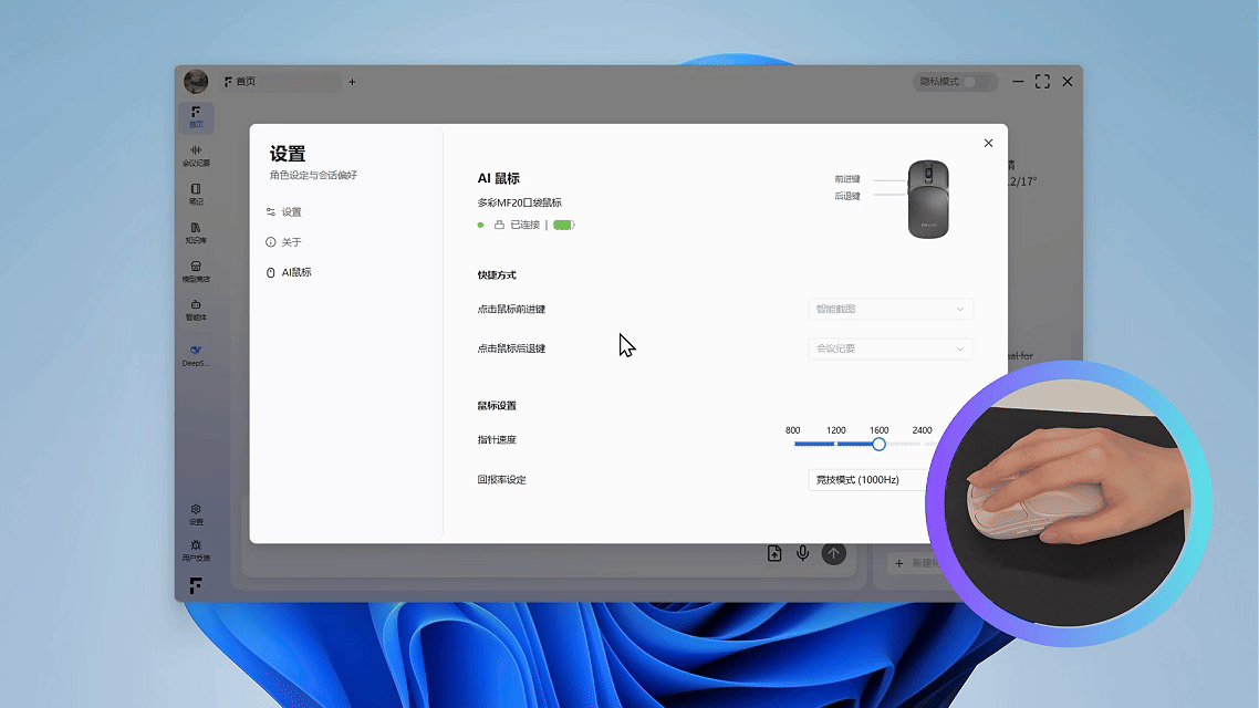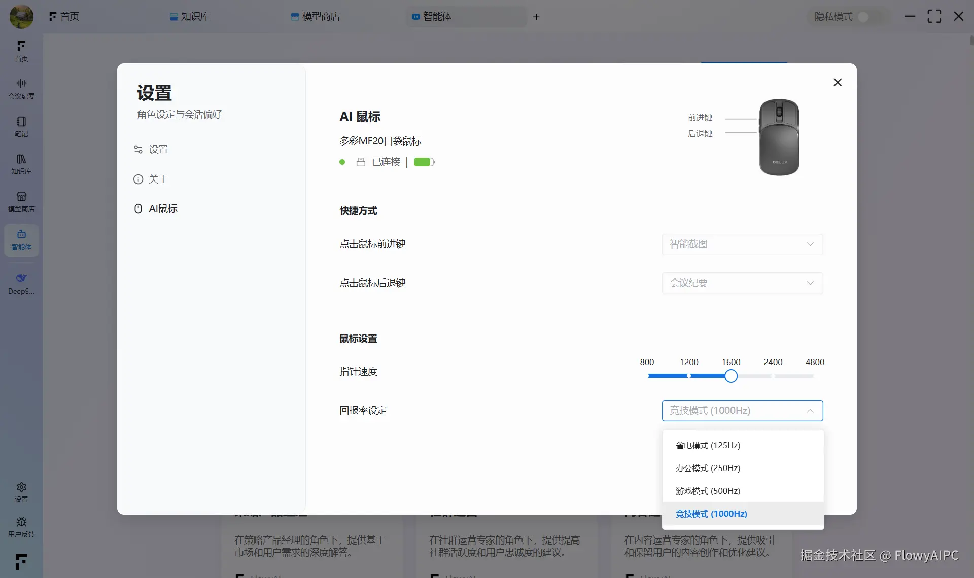 在 FlowyAIPC v4.0.3 中,新增 AI 鼠标设置,支持与多彩 AI 鼠标直接连接与管理。
