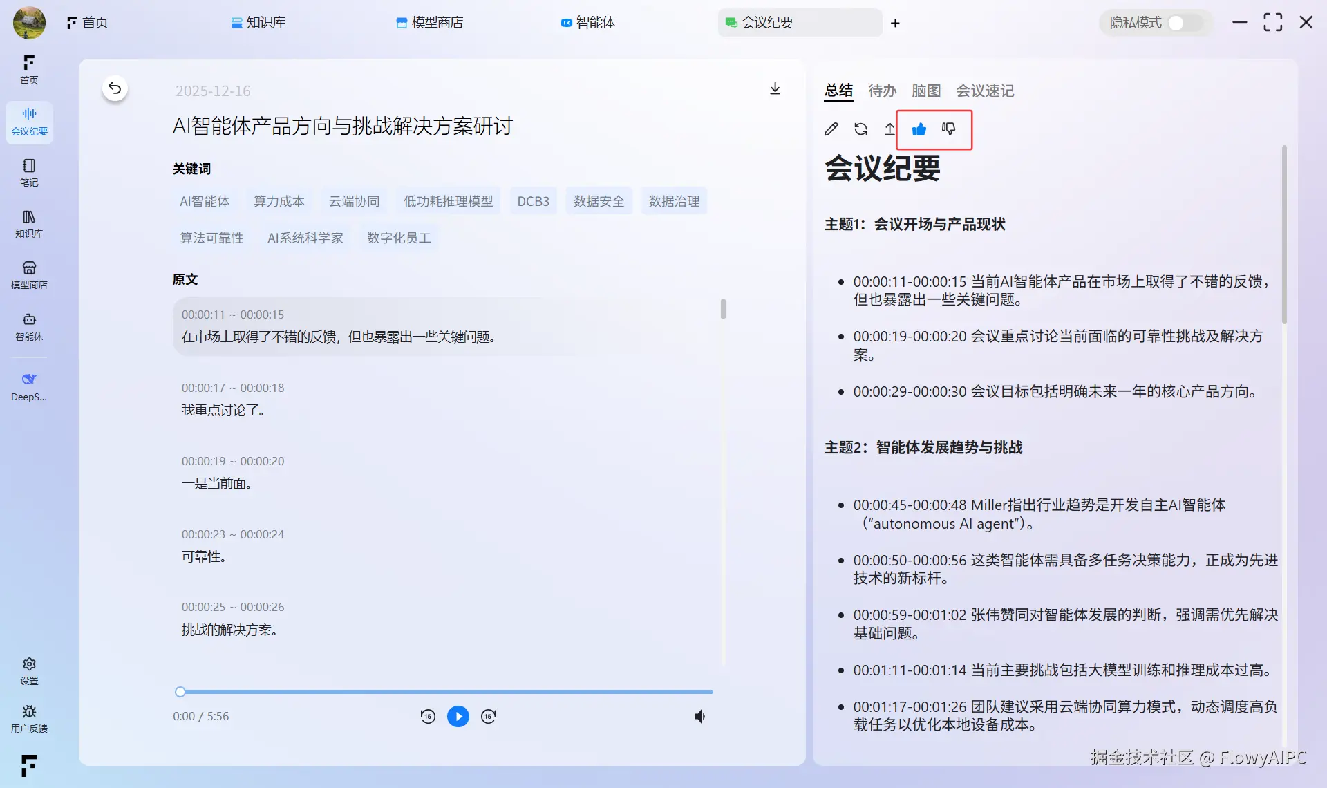 这一反馈机制将用于后续体验优化,让 FlowyAIPC会议纪要不再是“单向输出”。